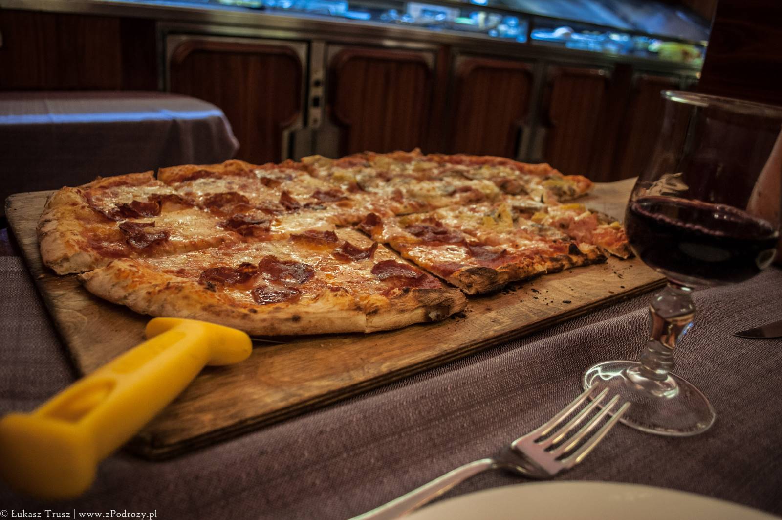 Oczywiście nie mogłem sobie odmówić spróbowania pizzy i na szczęście się nie zawiodłem. Tym razem udało nam się wybrać na metrową pizzę prosto z pieca opalanego drewnem. Na szczęście pizza była prostokątna (co widać na fotkach), bo chyba z taką średnicą byśmy nie podołali. No i na podsumowanie gastronomicznym doznań nieodłącznym elementem było winno, którego też zakosztowałem słuszne ilości i złego słowa o nim powiedzieć nie mogę. Jeśli ktoś chciałby zaliczyć kulinarne wakacje to myślę, że Włochy są dobrym miejscem, aby jeść, pić, jeść, pić itd.