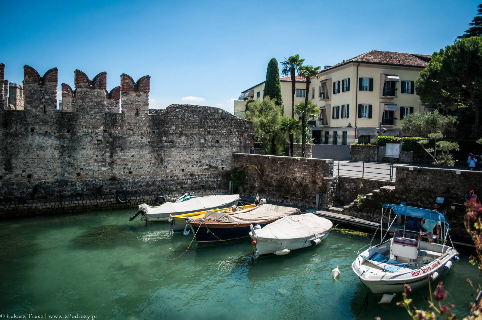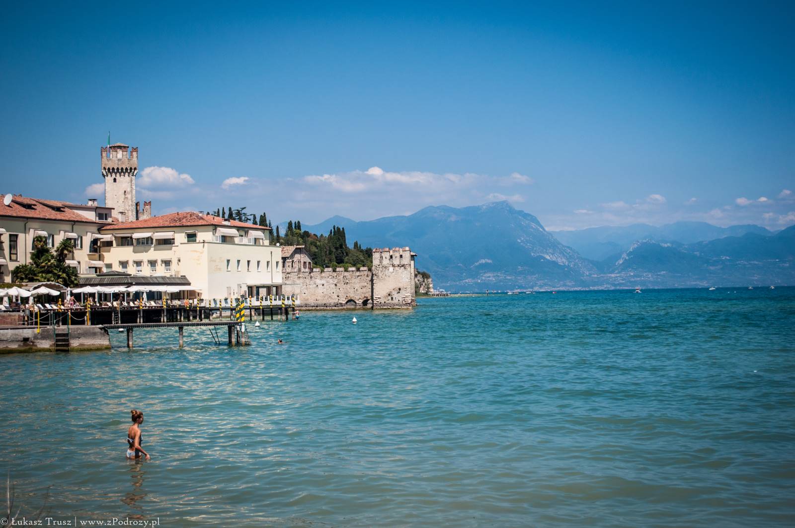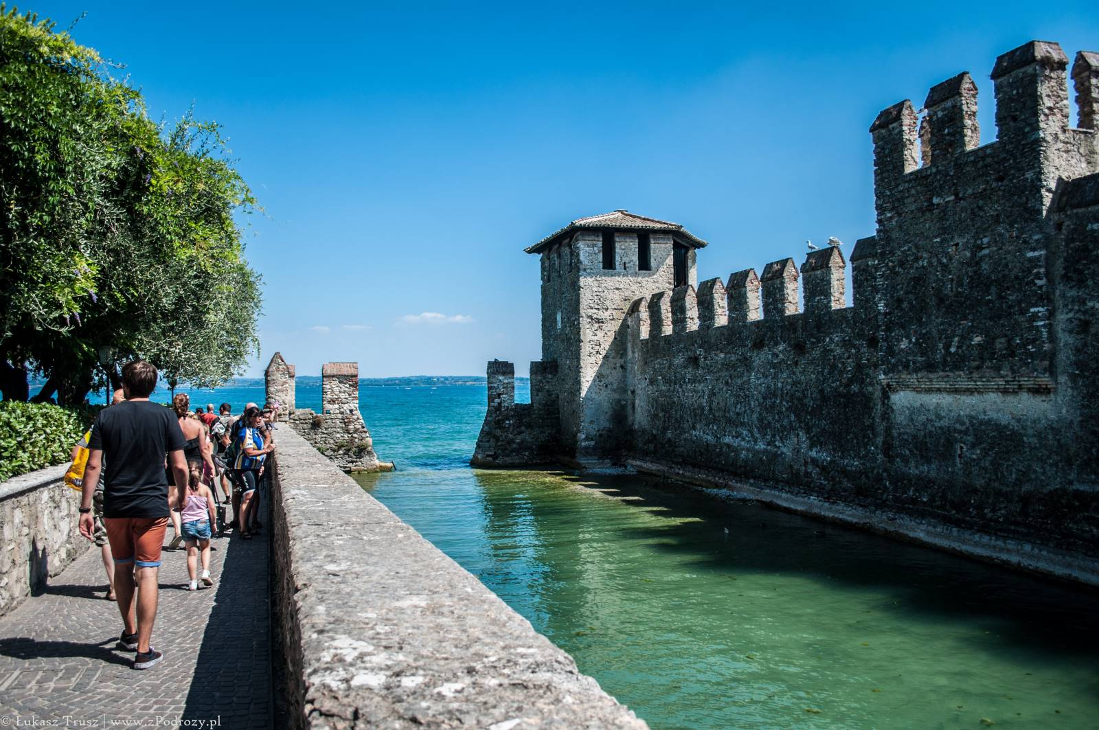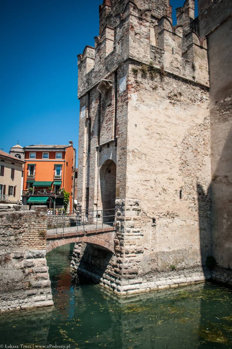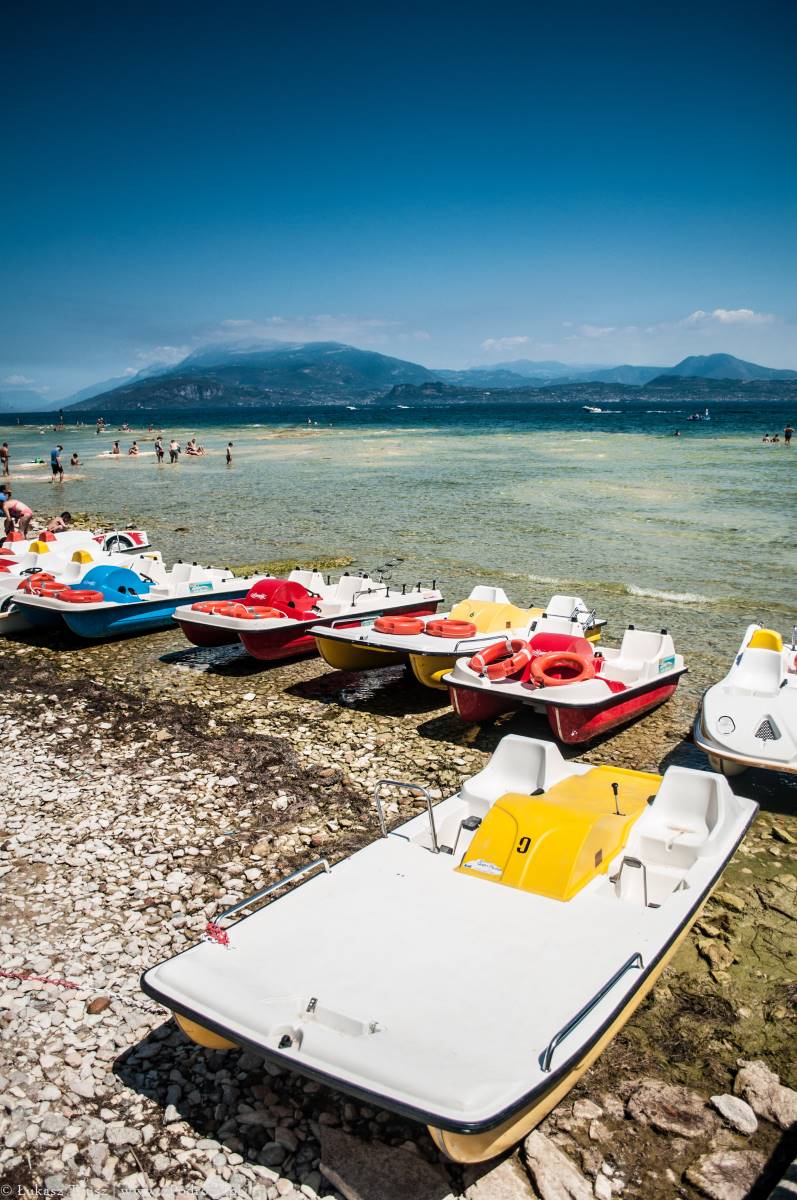 Sirmione! Wisienka na torcie całego wyjazdu, która niestety była tylko przystankiem w drodze powrotnej do domu. Mekka niemieckiej turystyki (zapewne jedna z wielu). Zdarzało się spotkać jeszcze belgijskie i holenderskie rejestracje i to byłaby pierwsza trójka, która tymczasowo zaludniała tą miejscowość lub przynajmniej część, w której się zatrzymaliśmy. A co o samym mieście? Jest piękne! Położone na półwyspie nad jeziorem Garda z widniejącymi w tle górami. W środku miasta znajdują się urokliwe średniowieczne budowle, małe sklepiki z pamiątkami, restauracje i przytulne knajpki. Jeśli komuś nie przeszkadzają ludzie rozlewający się po ulicach, trawnikach, kamieniach i plażach, to jest to miejsce na pewno warte odwiedzenia może nawet na kilka dni.