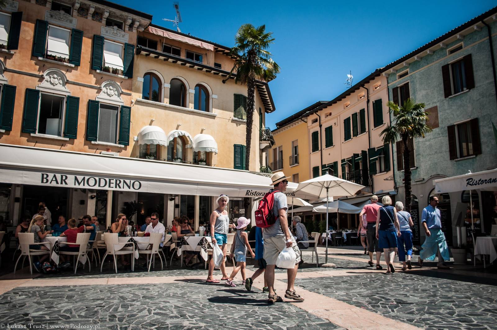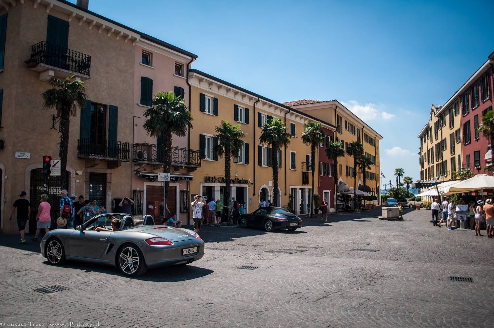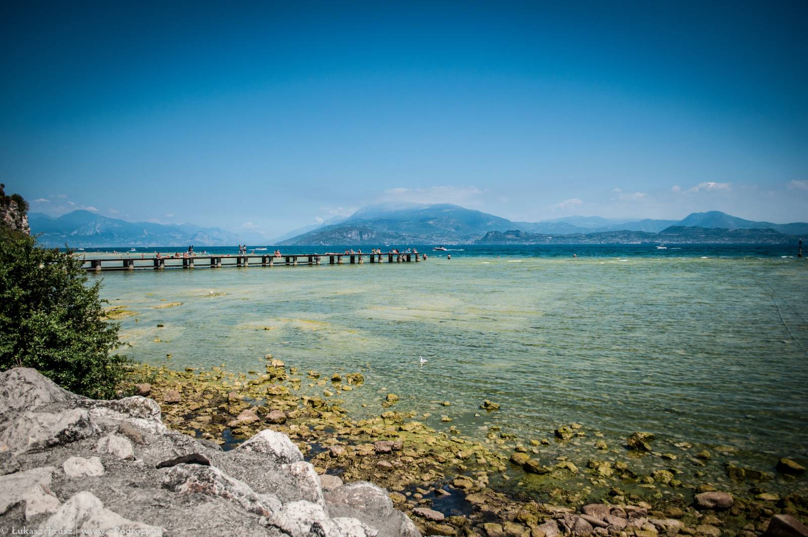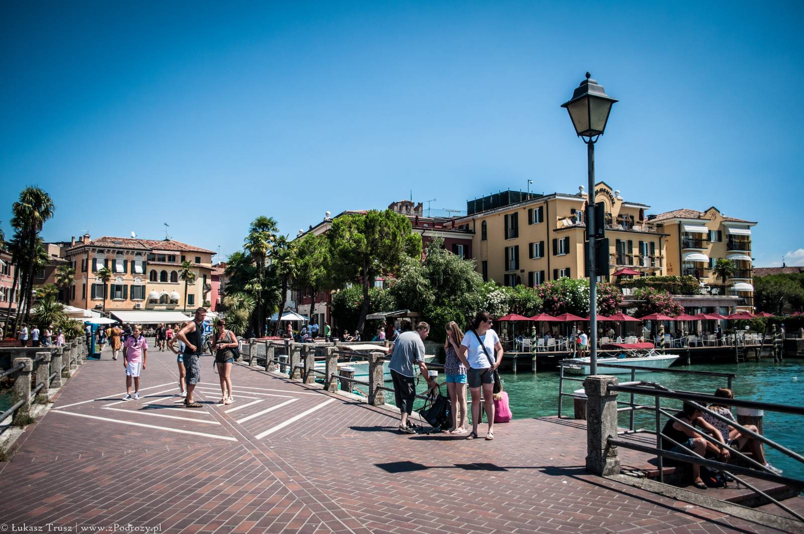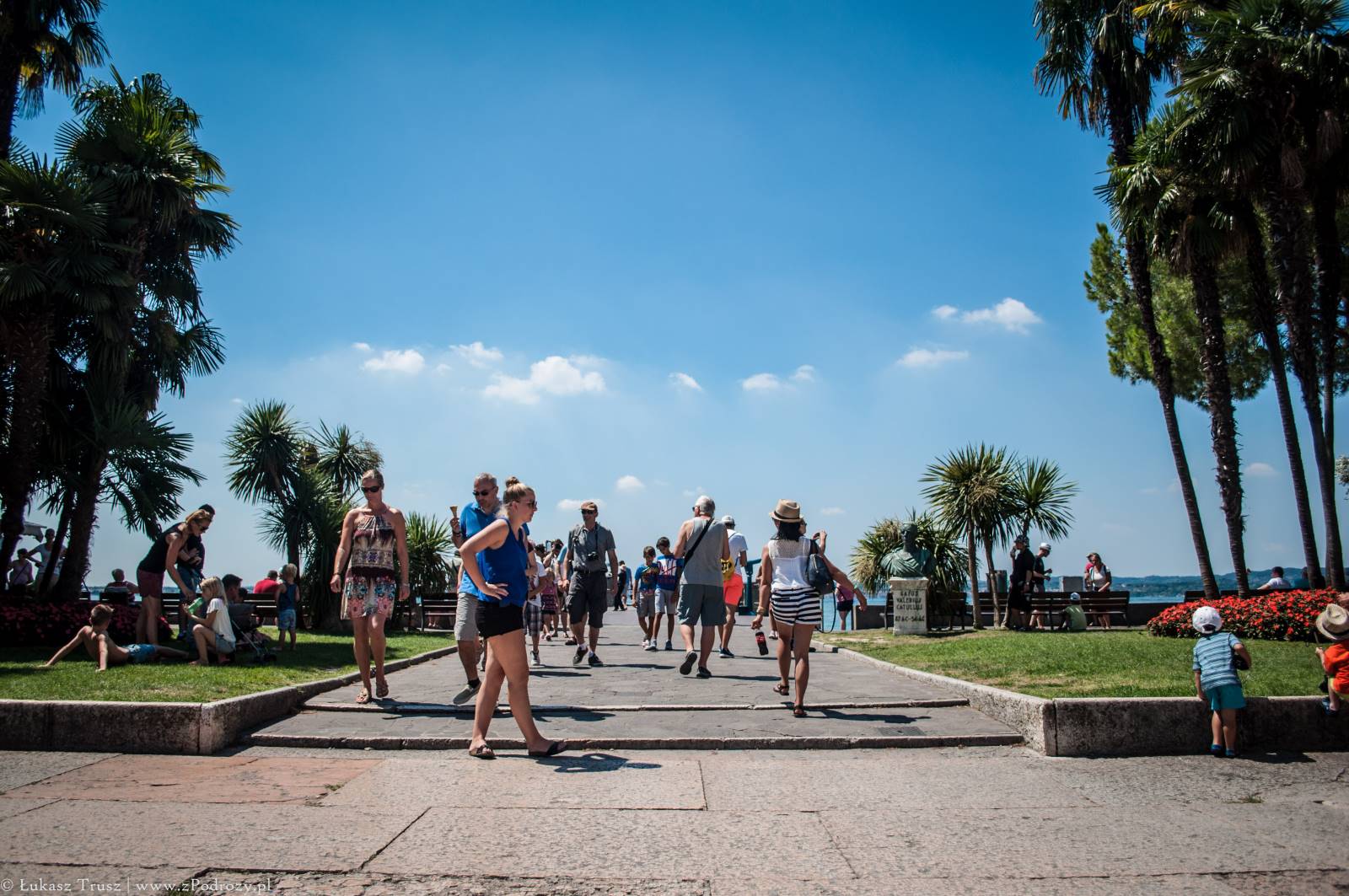 Sirmione! Wisienka na torcie całego wyjazdu, która niestety była tylko przystankiem w drodze powrotnej do domu. Mekka niemieckiej turystyki (zapewne jedna z wielu). Zdarzało się spotkać jeszcze belgijskie i holenderskie rejestracje i to byłaby pierwsza trójka, która tymczasowo zaludniała tą miejscowość lub przynajmniej część, w której się zatrzymaliśmy. A co o samym mieście? Jest piękne! Położone na półwyspie nad jeziorem Garda z widniejącymi w tle górami. W środku miasta znajdują się urokliwe średniowieczne budowle, małe sklepiki z pamiątkami, restauracje i przytulne knajpki. Jeśli komuś nie przeszkadzają ludzie rozlewający się po ulicach, trawnikach, kamieniach i plażach, to jest to miejsce na pewno warte odwiedzenia może nawet na kilka dni.