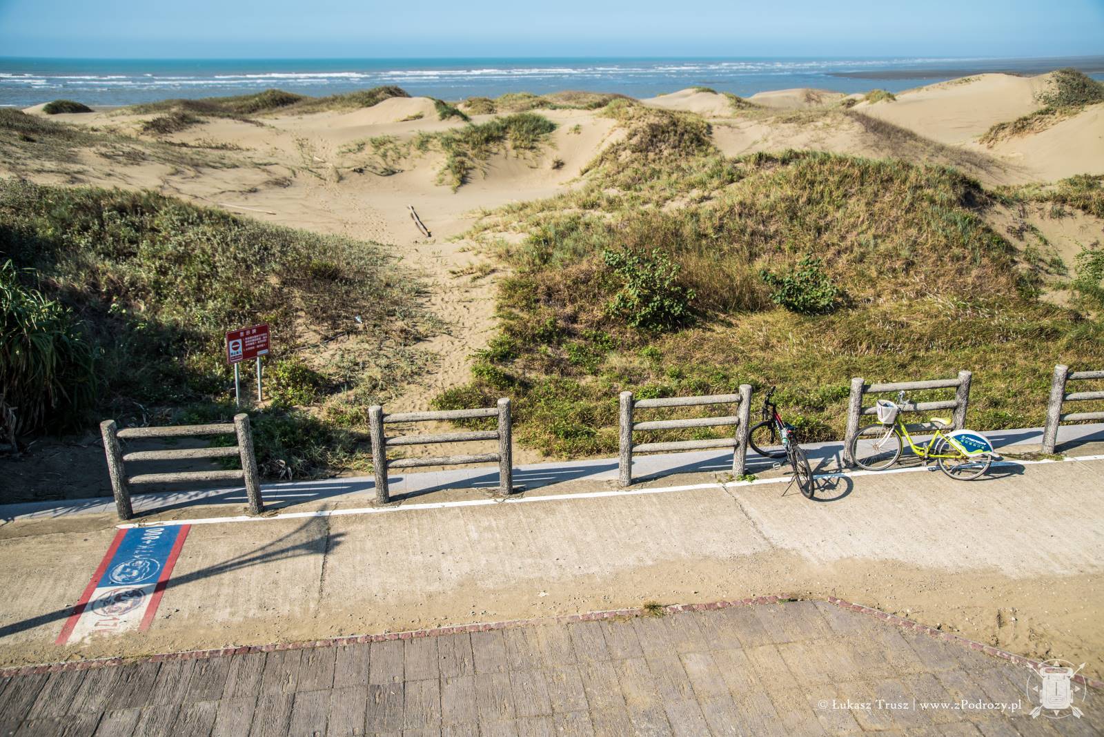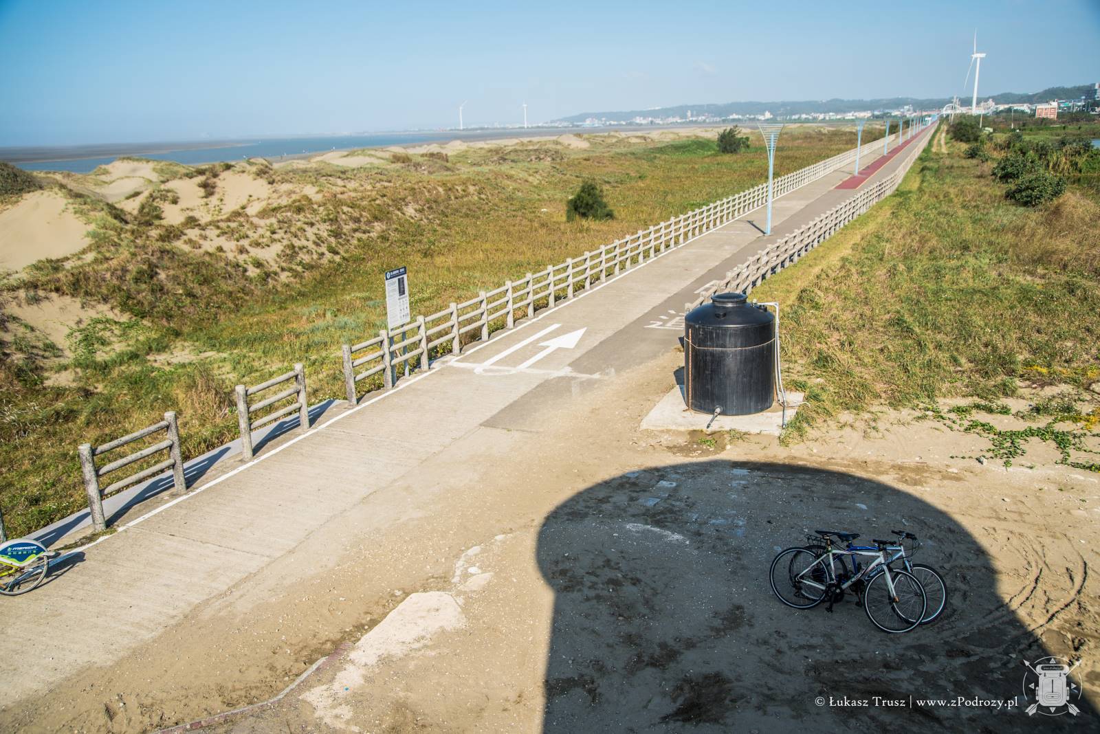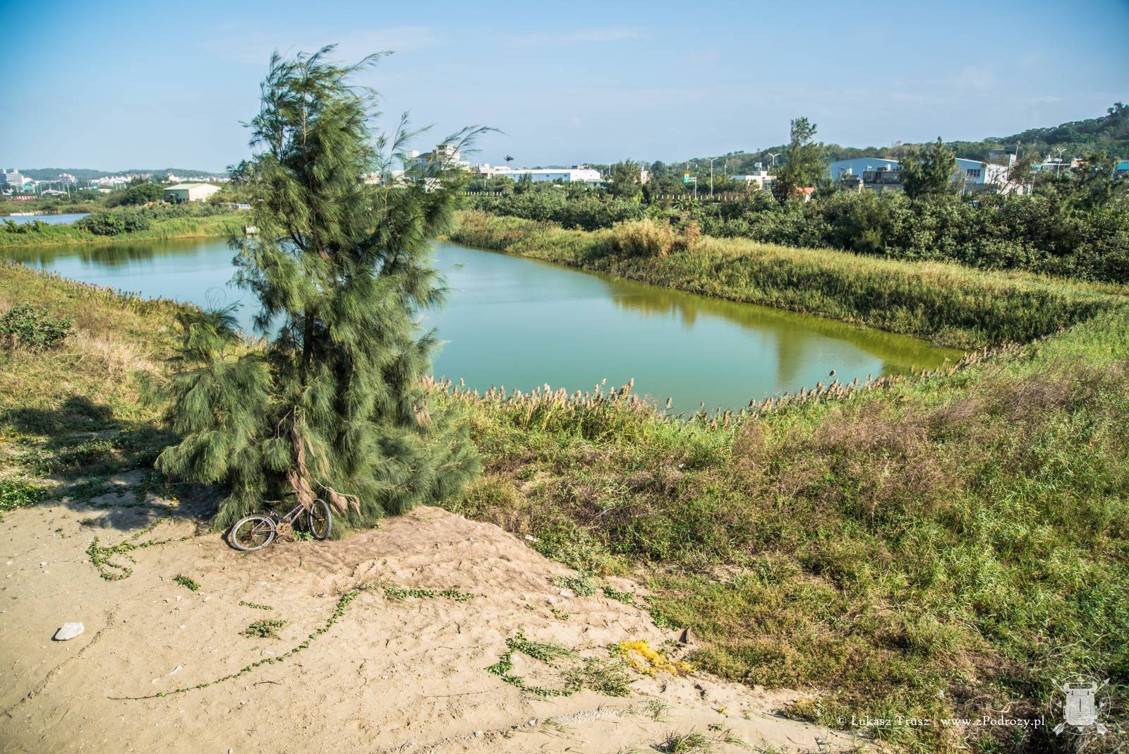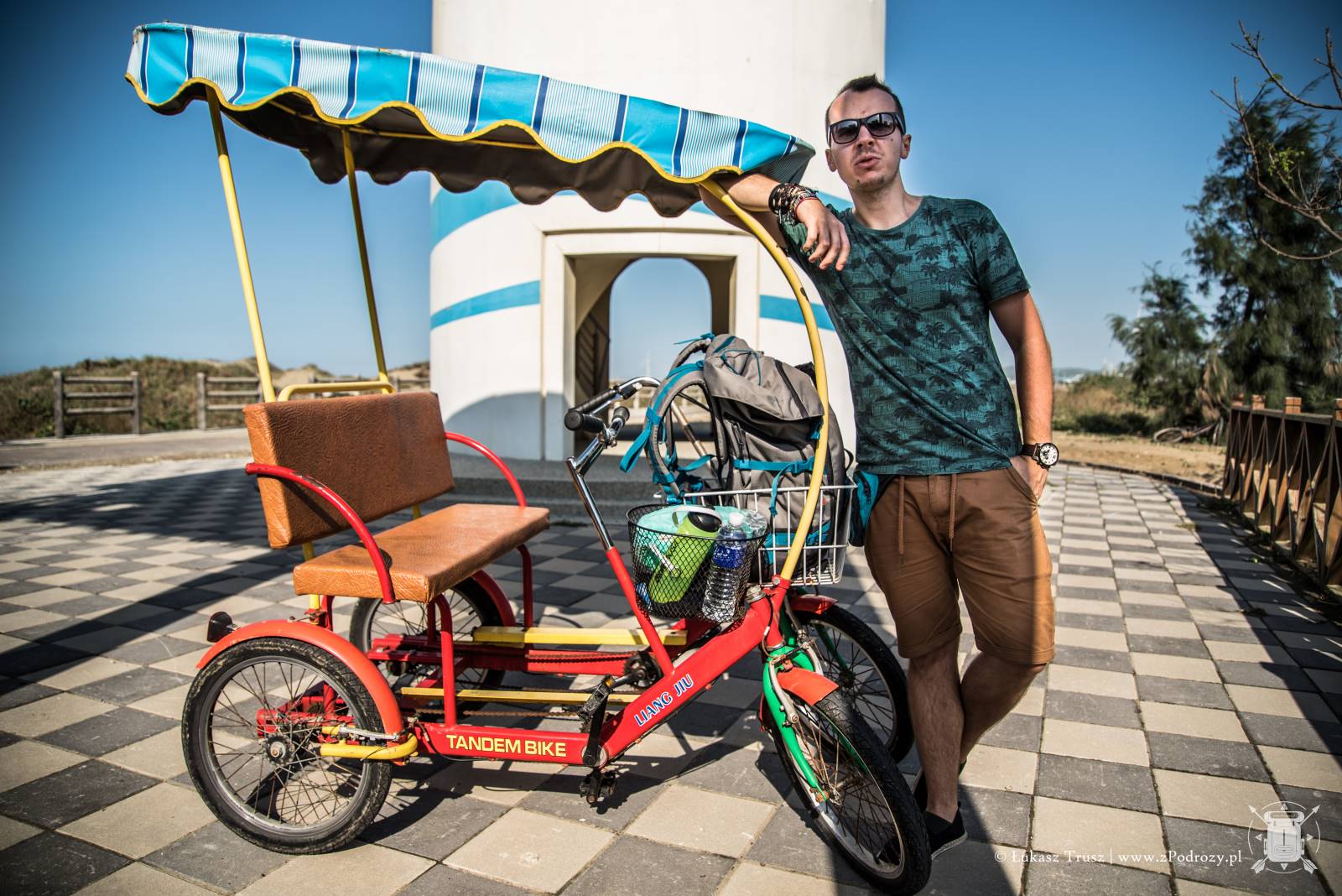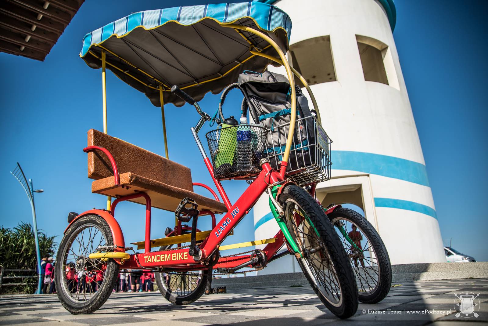 Główną atrakcją miasta, jaką nam poleciła Joanna – nasza gospodyni, która faktycznie tak się nazywa (też nie mogłem do końca w to uwierzyć) jest wybrzeże miasta i 17-kilometrowa rowerowa trasa z punktami widokowymi. W sumie powinienem napisać, że 34-kilometrowa, ponieważ wypożyczając rower musieliśmy go oddać w punkcie odbioru. Niestety całe nabrzeże włącznie z deptakami, ulicami, a nawet knajpkami było w jednym wielkim remoncie, wiec do zobaczenia niewiele się ostało. Poszliśmy zatem wypożyczyć nasz 2-osobowy rower i ruszyć ku przygodzie. Taki rarytas kosztował nas 400 NT$, czyli niecałe 50zł za cały dzień. Trzeba przyznać, że trasa jest spokojna i można odpocząć od zgiełku miasta, natomiast widoki przypominają raczej obserwacje mułu, gdyż musieliśmy trafić na jakiś spory odpływ. Wyjątkowo podczas tej trasy kręciliśmy więcej filmów niż zdjęć, ale nie doczekały się one jeszcze poskładania w całość.