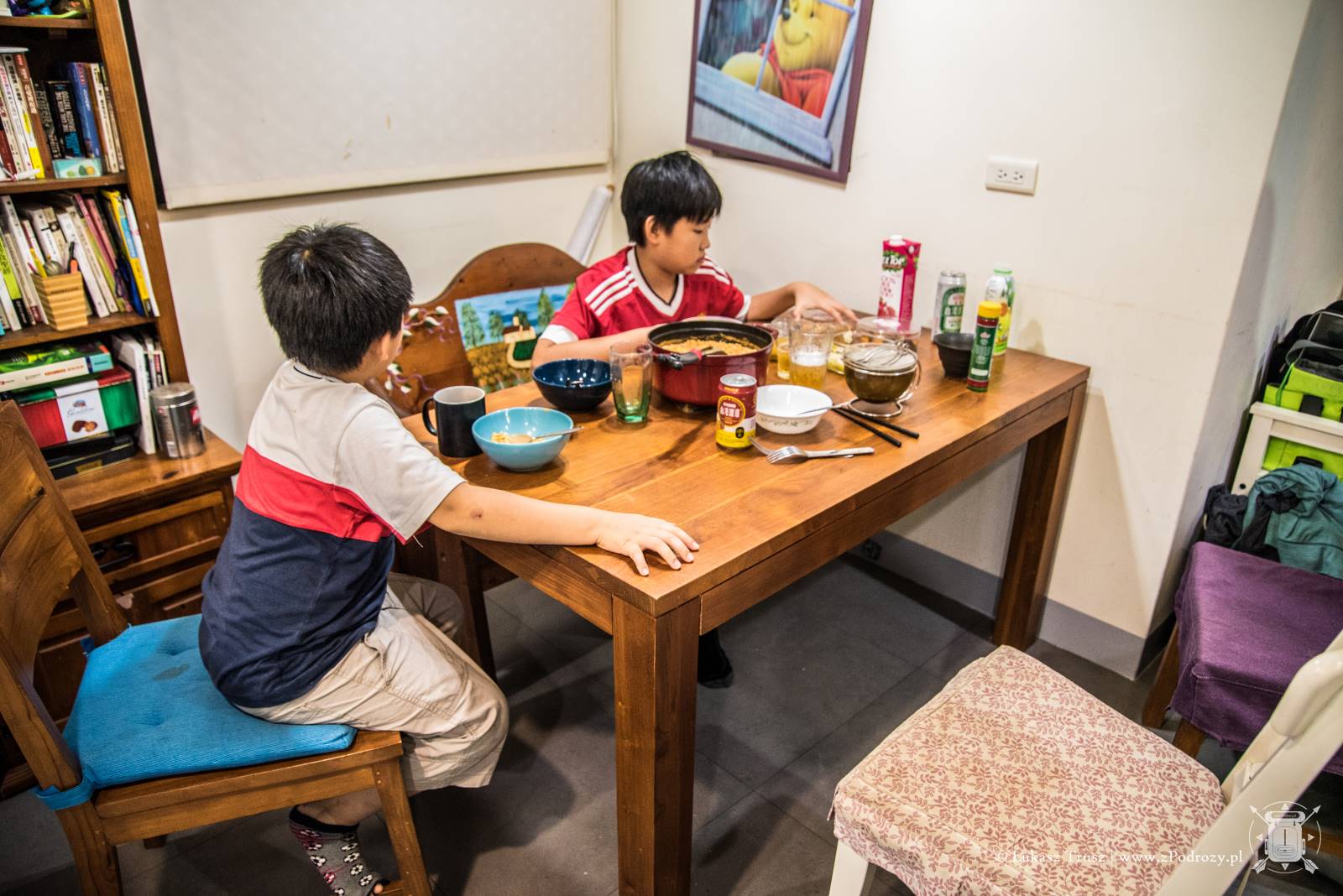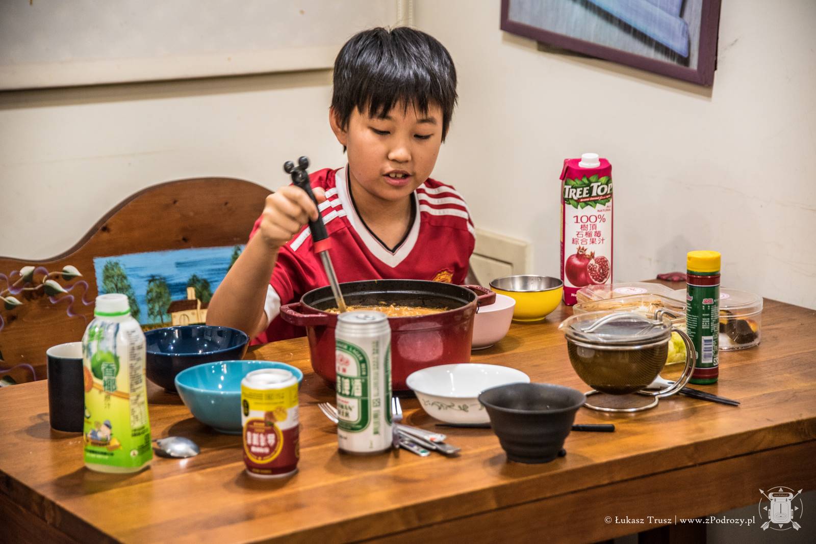 Wracamy do Joanny. Ze sklepu zgarnął nas jej mąż, a w drzwiach przywitał Nathan słowami “jak się masz?”. Na początku myślałem, że coś mi się przesłyszało i odpowiedziałem coś po angielsku. Okazało się, że Nathan ma polsko-tajwańskie korzenie i do swojej 18-stki przez 10 lat mieszkał i wychowywał się w Warszawie. Niestety swoją 18-stkę spędził w USA, więc nie wie z czym to się je (a właściwie pije) w Polsce. Jego tato jest amerykańskim misjonarzem o polskich korzeniach (i nazwisku) i w tamtym czasie stacjonował w Polsce. Są takie sytuacje, których nawet byśmy sobie nie wyobrazili. Jakież było również zdziwienie Joanny i jej rodziny, jak okazało się, że z Nathanem rozmawiamy sobie całkiem swobodnie po polsku. Skąd jednak wziął się on w ich domu i co robi w Tajwanie? Z racji swoich tajwańskich korzeni wrócił na wyspę kontynuować naukę języka chińskiego, a sam pracuje jako lektor angielskiego i między innymi uczył angielskiego dzieci Joanny. Ot i cała historia. Gar zupy pomidorowej oczywiście zniknął w mgnieniu oka. Dzieciaki zjadły po 4 miski, gdzie ja ledwo wcisnąłem jedną i stwierdziły, że od teraz to ich ulubiona zupa!