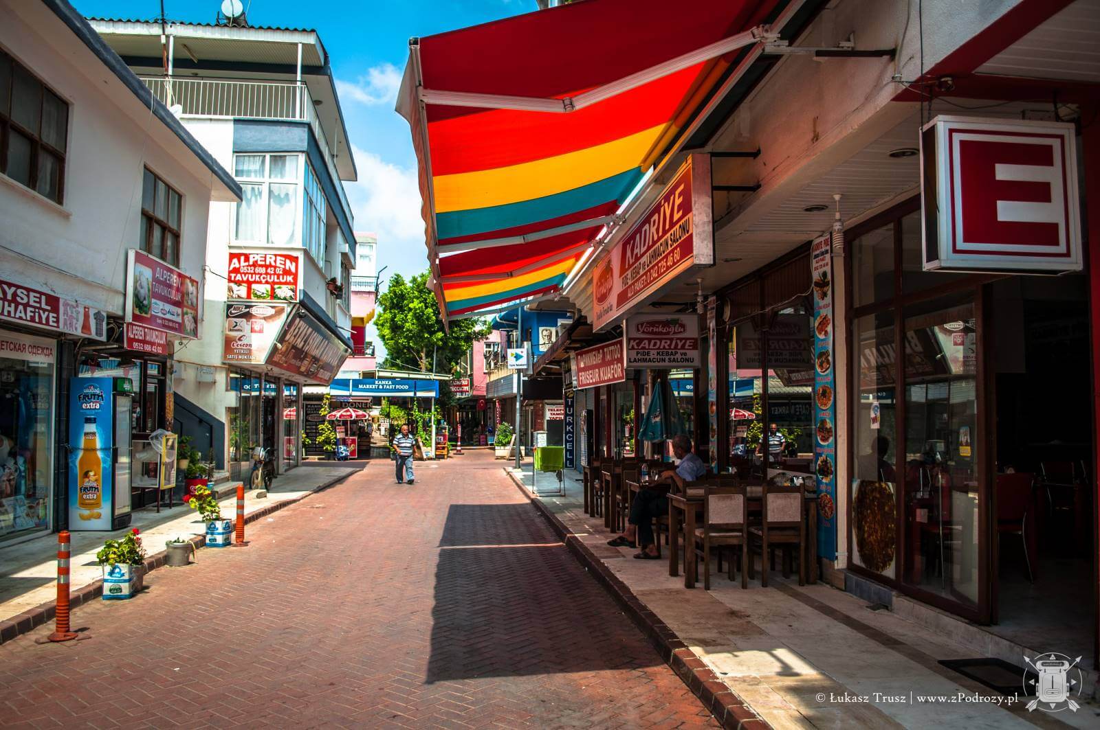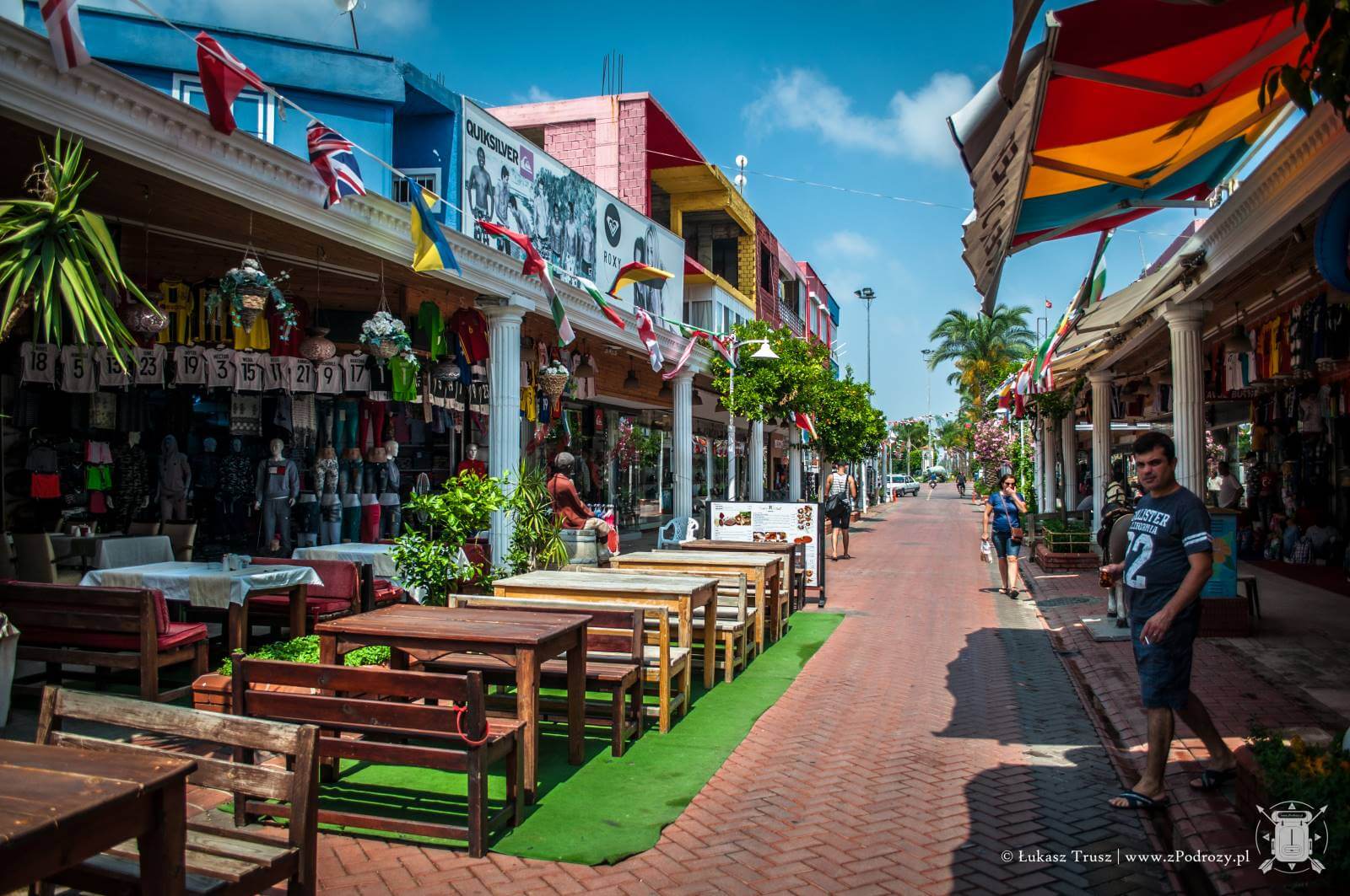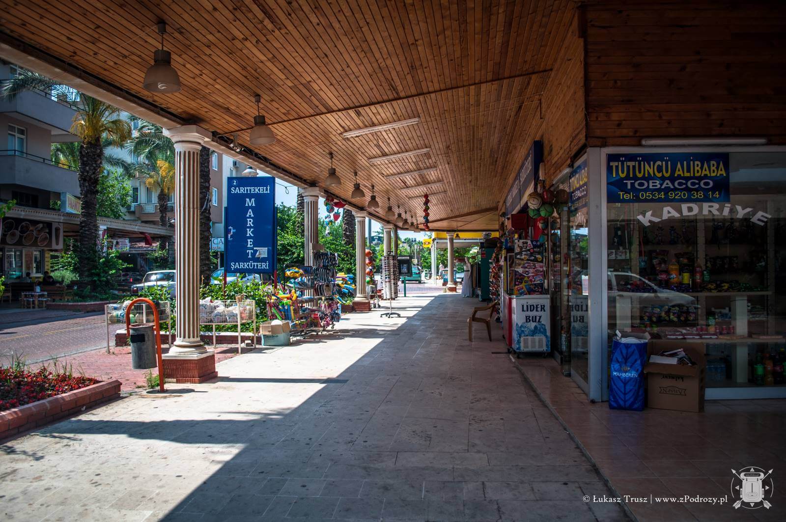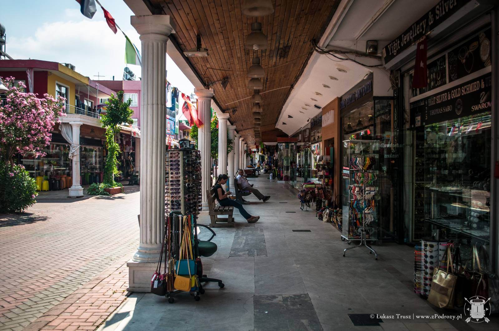 Co do samego wyglądu wszystko jest ładne i piękne tam gdzie chodzą turyści. Zabytkowe kolumny niczym z Grecji wykonane ze styropianu i przemalowane farbą. Ozdobione stoiska i flagi Turcji. Fakt faktem ulica z podwieszonymi parasolami, którą zobaczycie na zdjęciach robi świetne wrażenie. Tak samo zobaczycie białe busy jeżdżące z kurortów na bazar. To właśnie punkt zapalny do zmotywowania Turków do pracy. Póki nie przyjedzie bus z turystami napalonymi na cudowne okazje i wydanie bezcennych dolarów, to życie praktycznie nie istnieje. Natomiast gdy tylko podjadą busy, to wszystko nagle kwitnie i budzi się do życia, a tureccy handlarze są w końcu w swoim żywiole. Niby fajnie, ale wszystko wydaje się być robione na pokaz, więc nie poczujemy klimatu prawdziwego targowiska, na którym targują się lokalni bywalcy. Wystarczy przejść kawałeczek dalej i zobaczymy, że zaraz za sklepikami są rozwalające się budynki, stare samochody, kury biegające po trawie i tylko jeszcze bieda tu nie piszczy.