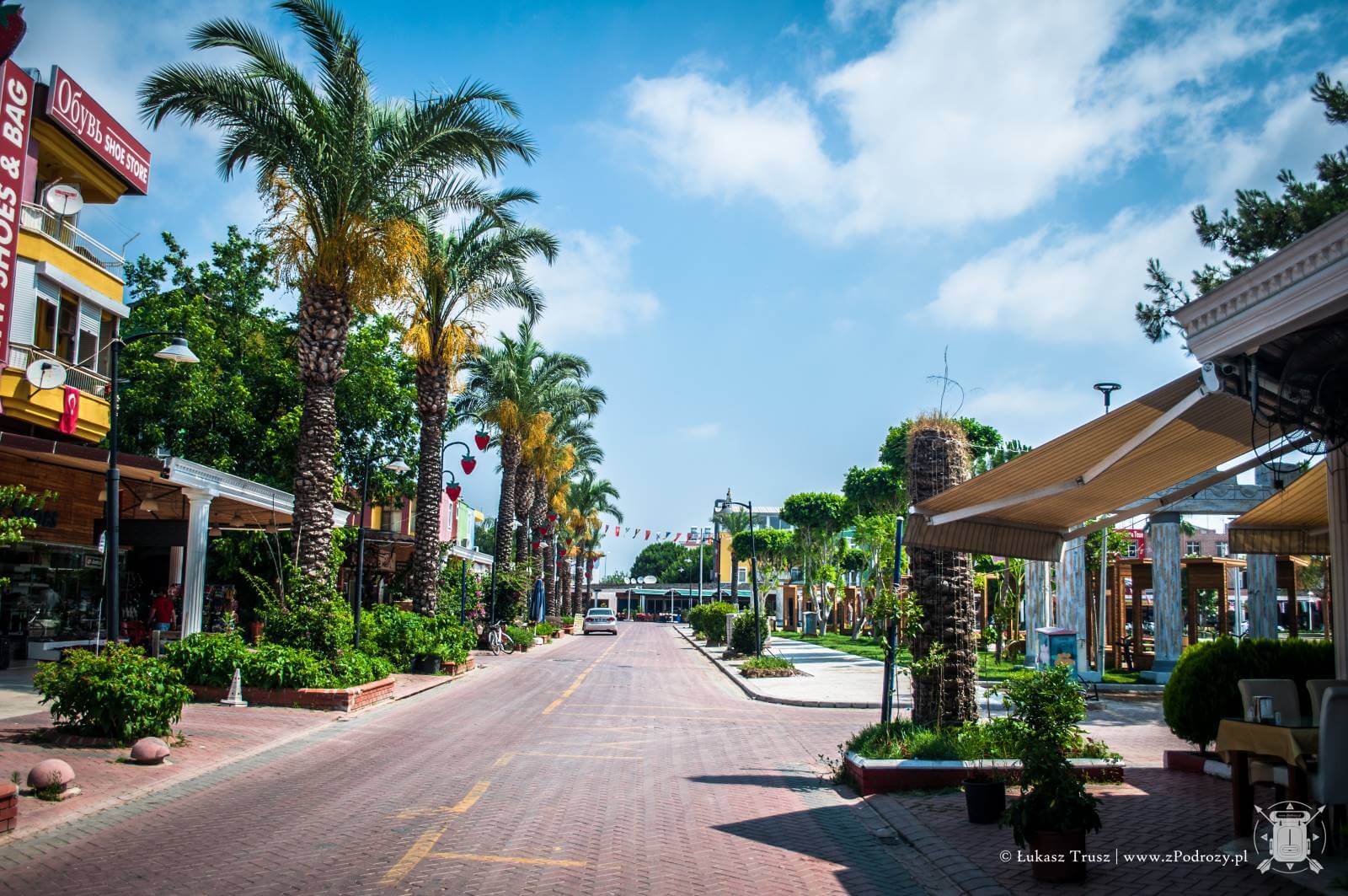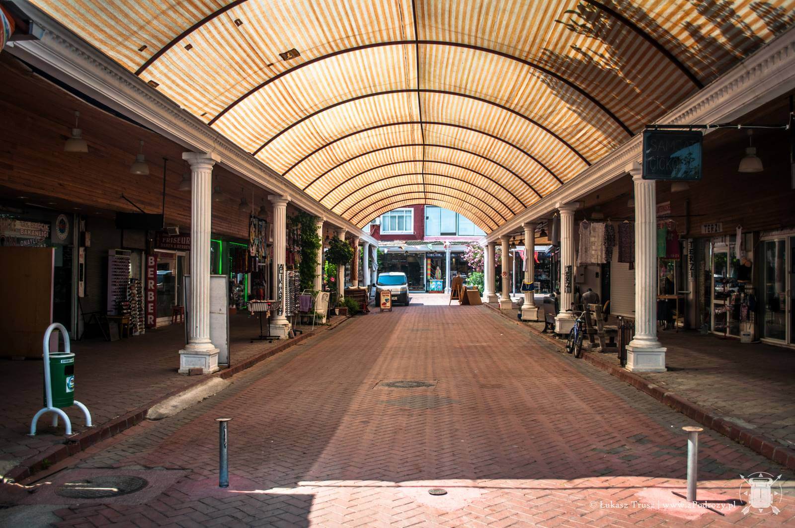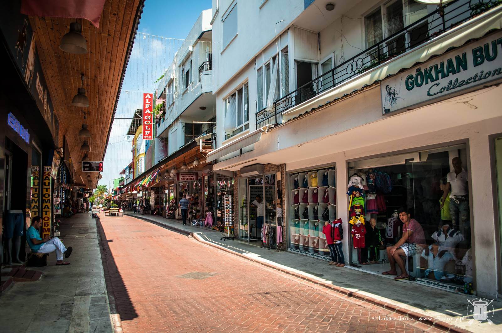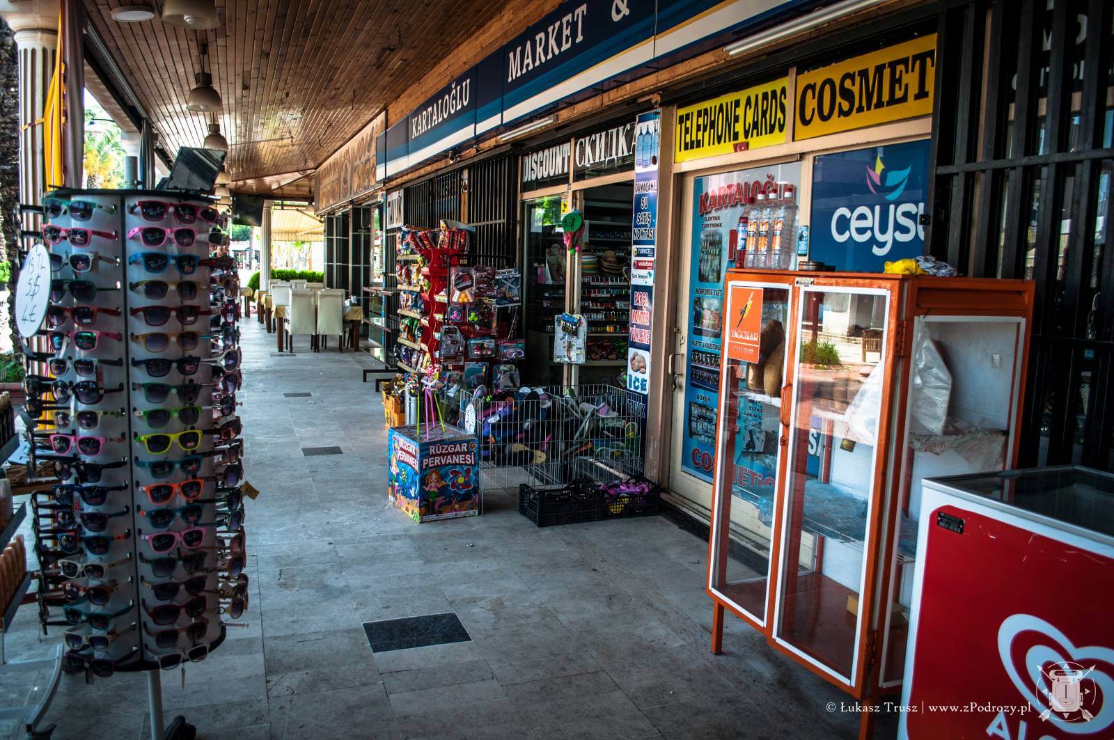 Co do samego wyglądu wszystko jest ładne i piękne tam gdzie chodzą turyści. Zabytkowe kolumny niczym z Grecji wykonane ze styropianu i przemalowane farbą. Ozdobione stoiska i flagi Turcji. Fakt faktem ulica z podwieszonymi parasolami, którą zobaczycie na zdjęciach robi świetne wrażenie. Tak samo zobaczycie białe busy jeżdżące z kurortów na bazar. To właśnie punkt zapalny do zmotywowania Turków do pracy. Póki nie przyjedzie bus z turystami napalonymi na cudowne okazje i wydanie bezcennych dolarów, to życie praktycznie nie istnieje. Natomiast gdy tylko podjadą busy, to wszystko nagle kwitnie i budzi się do życia, a tureccy handlarze są w końcu w swoim żywiole. Niby fajnie, ale wszystko wydaje się być robione na pokaz, więc nie poczujemy klimatu prawdziwego targowiska, na którym targują się lokalni bywalcy. Wystarczy przejść kawałeczek dalej i zobaczymy, że zaraz za sklepikami są rozwalające się budynki, stare samochody, kury biegające po trawie i tylko jeszcze bieda tu nie piszczy.