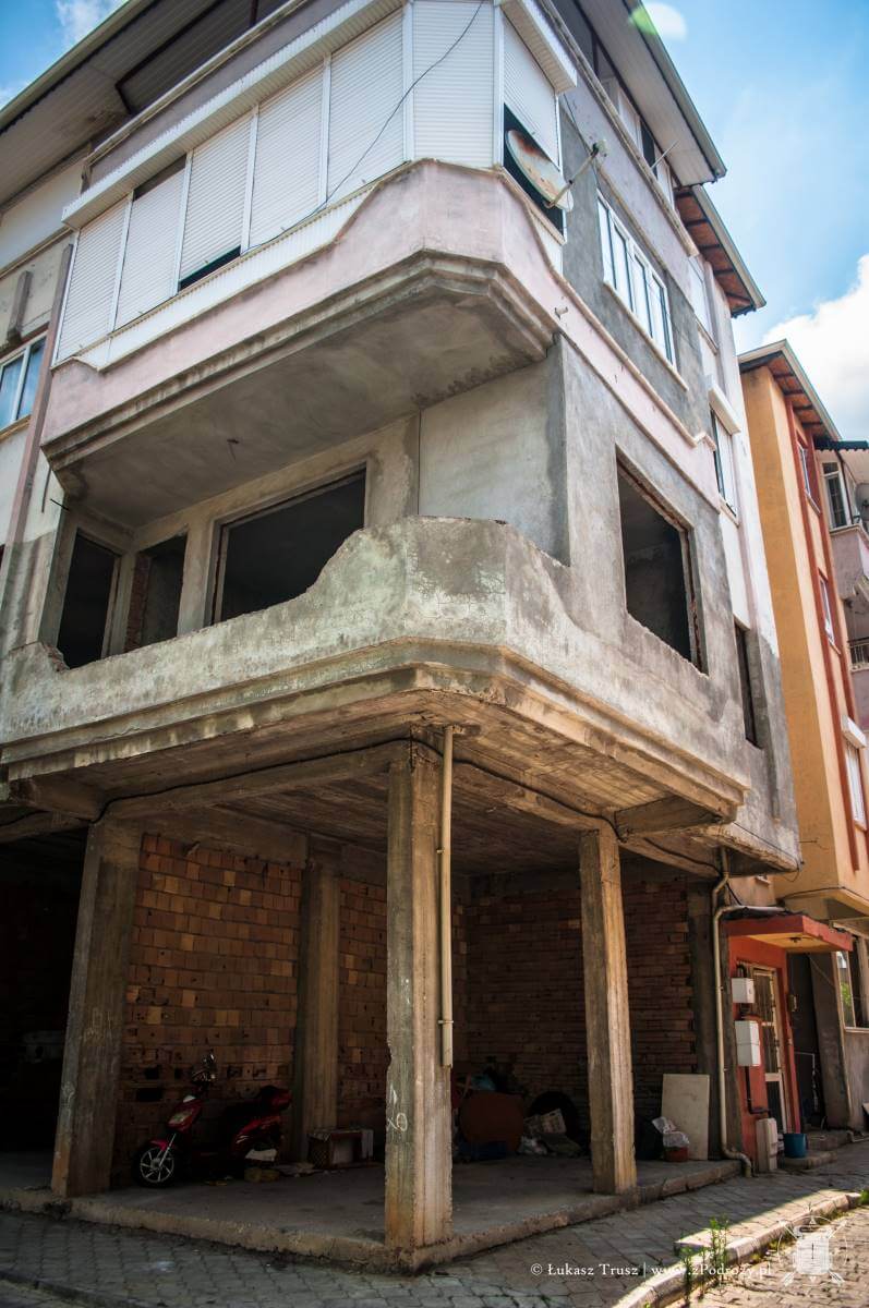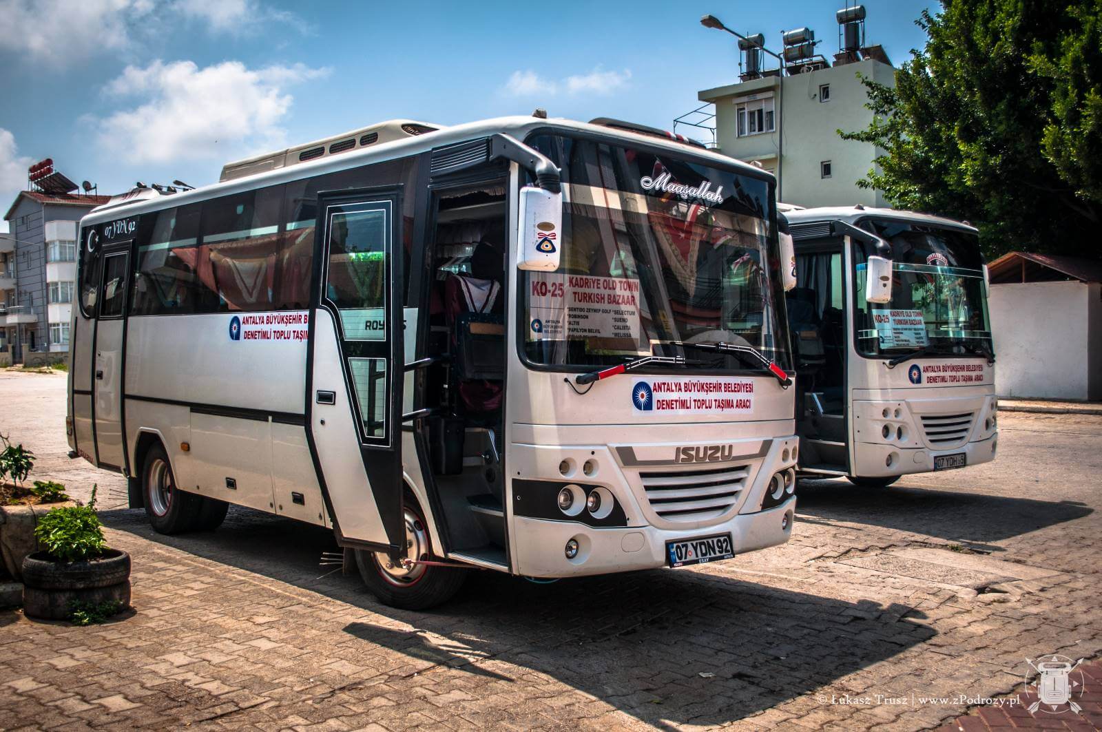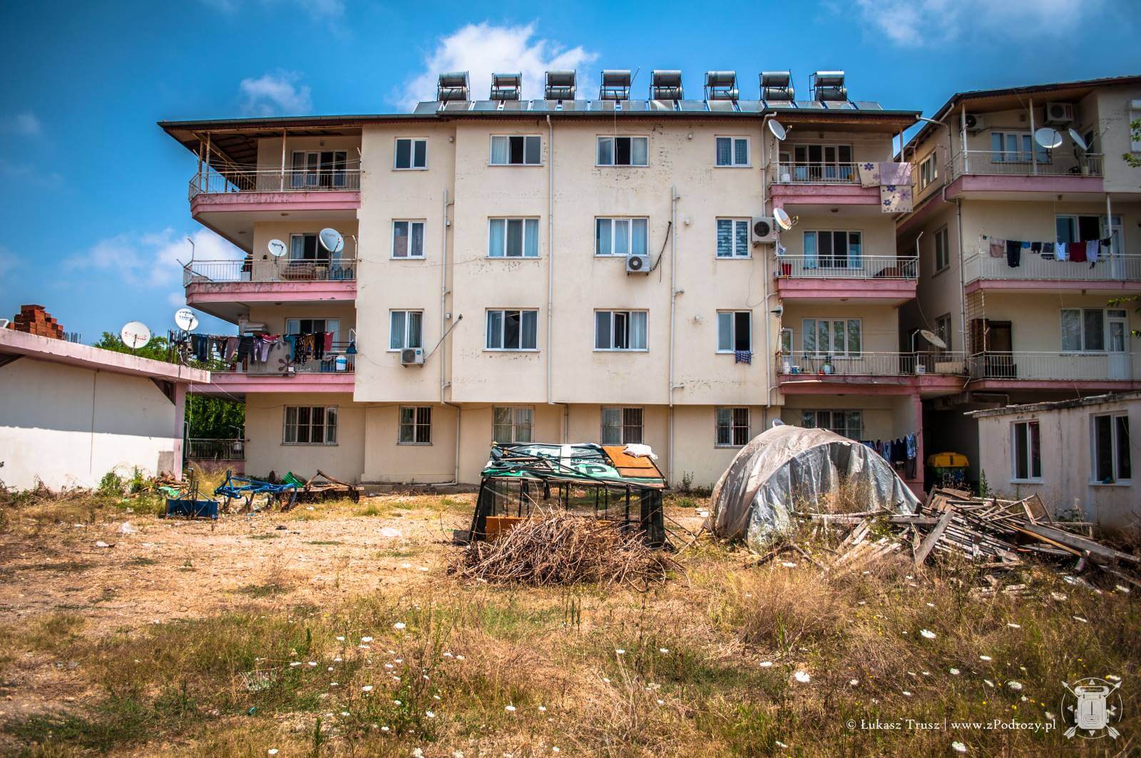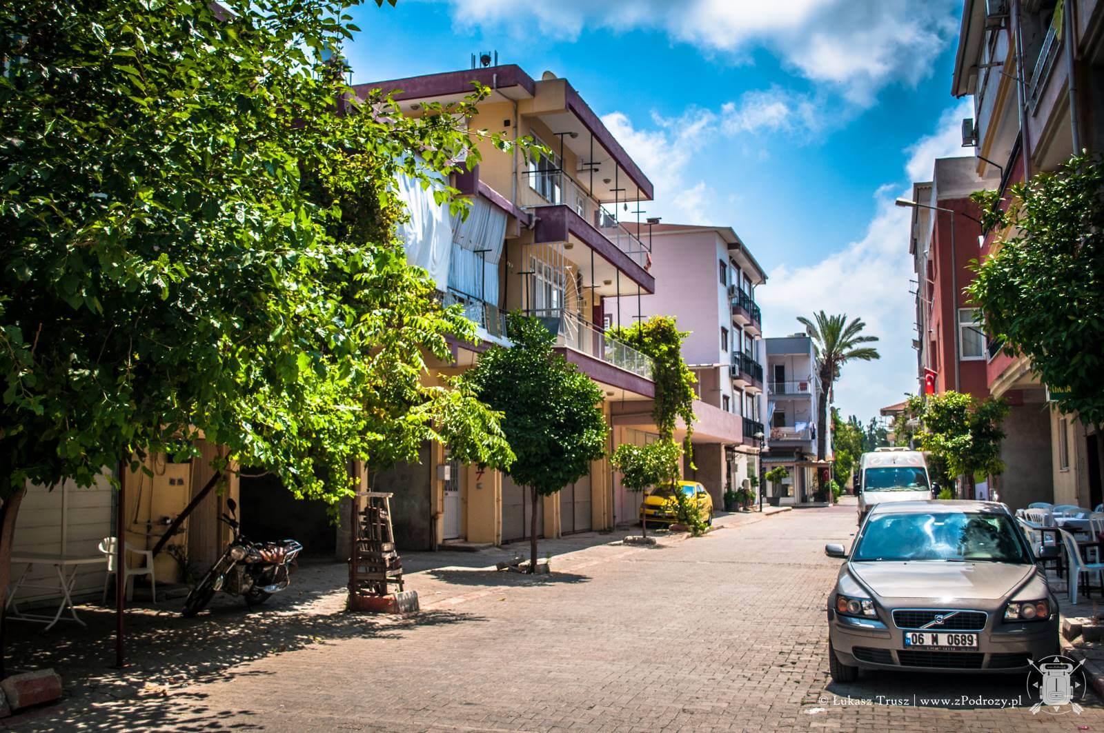 Co do samego wyglądu wszystko jest ładne i piękne tam gdzie chodzą turyści. Zabytkowe kolumny niczym z Grecji wykonane ze styropianu i przemalowane farbą. Ozdobione stoiska i flagi Turcji. Fakt faktem ulica z podwieszonymi parasolami, którą zobaczycie na zdjęciach robi świetne wrażenie. Tak samo zobaczycie białe busy jeżdżące z kurortów na bazar. To właśnie punkt zapalny do zmotywowania Turków do pracy. Póki nie przyjedzie bus z turystami napalonymi na cudowne okazje i wydanie bezcennych dolarów, to życie praktycznie nie istnieje. Natomiast gdy tylko podjadą busy, to wszystko nagle kwitnie i budzi się do życia, a tureccy handlarze są w końcu w swoim żywiole. Niby fajnie, ale wszystko wydaje się być robione na pokaz, więc nie poczujemy klimatu prawdziwego targowiska, na którym targują się lokalni bywalcy. Wystarczy przejść kawałeczek dalej i zobaczymy, że zaraz za sklepikami są rozwalające się budynki, stare samochody, kury biegające po trawie i tylko jeszcze bieda tu nie piszczy.