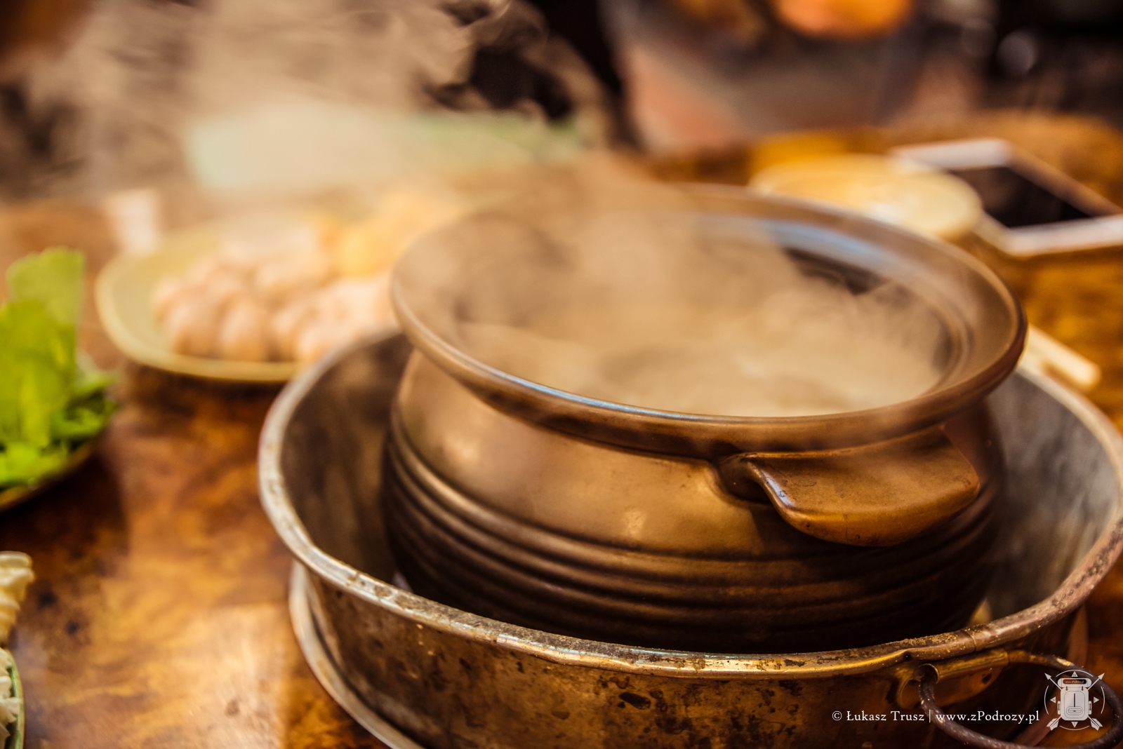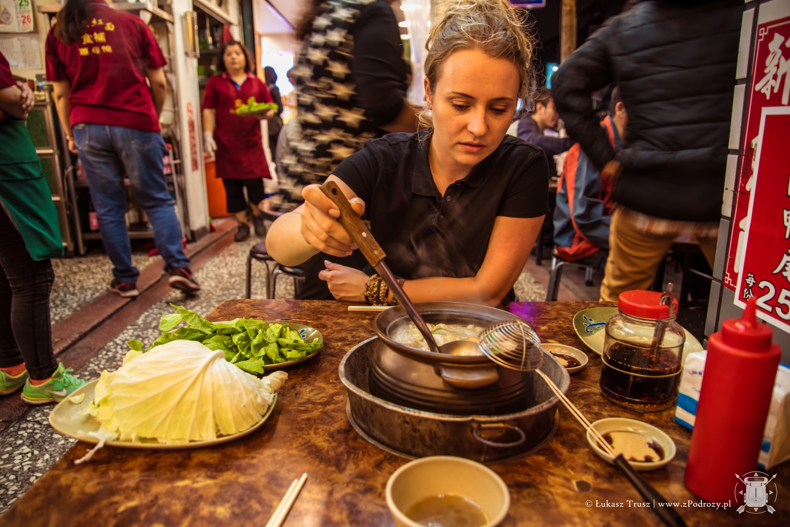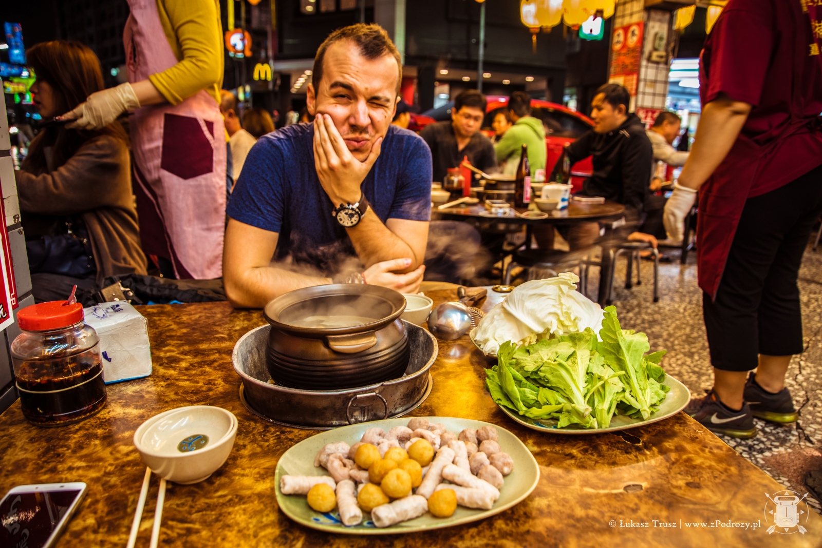 Co do jedzenia to trafiliśmy tutaj na swój pierwszy “hot pot”, czyli dosłownie “gorący garnek”! Jak to działa? A no już tłumaczę. Siadamy przy stole z dziurą po środku, która okuta jest metalową obręczą. Obsługa przynosi nam koszyk z żarem, który wkłada do dziury, a na to stawiają gar z gotującym się już wywarem. Dalej przejmujemy “kucharską pałeczkę” we własne ręce i czynimy cuda sami. Dostajemy także karteczkę z możliwością wyboru co chcemy, aby nam podano do gotowania (przeróżne mięsa, pierożki, itp.). Treść jest niestety po chińsku, więc udaję się żwawo do lady i mówię Pani, że biorę wszystko co polecają, bo ssie mnie nieziemsko! A tak serio, to wybudzam swoje pierwotne instynkty i macham palcami pokazując, co chętnie zaserwuje swoim kubkom smakowym. Pani ekspedientka dorzuca coś od siebie pokazując, że “to i to” też będzie super. Wracam do stołu, mija chwila i dostajemy 2 talerze z zieleniną i resztę mięsnych smakołyków. Ucztować tak można do białego rana. Gdy wywaru braknie, to nam za darmo dolewają. A przyznać muszę, że był wyborny! Nawet sama zielenina popijana tajwańskim rosołem smakowała jak wykwintne danie.