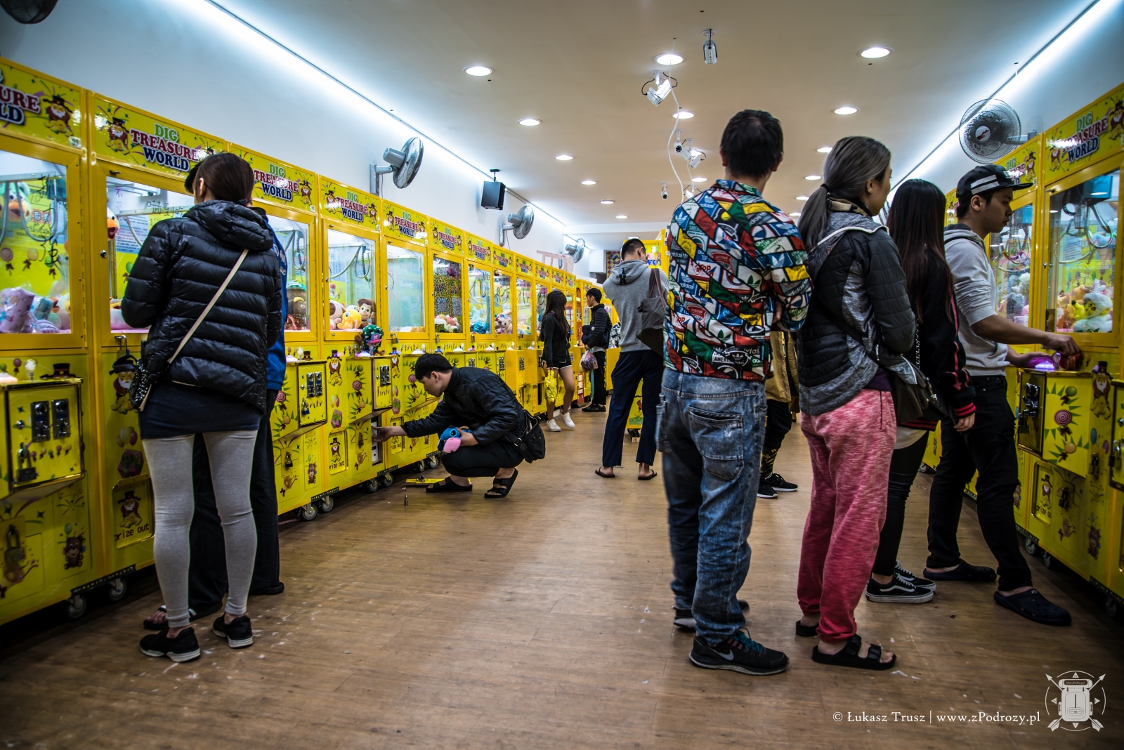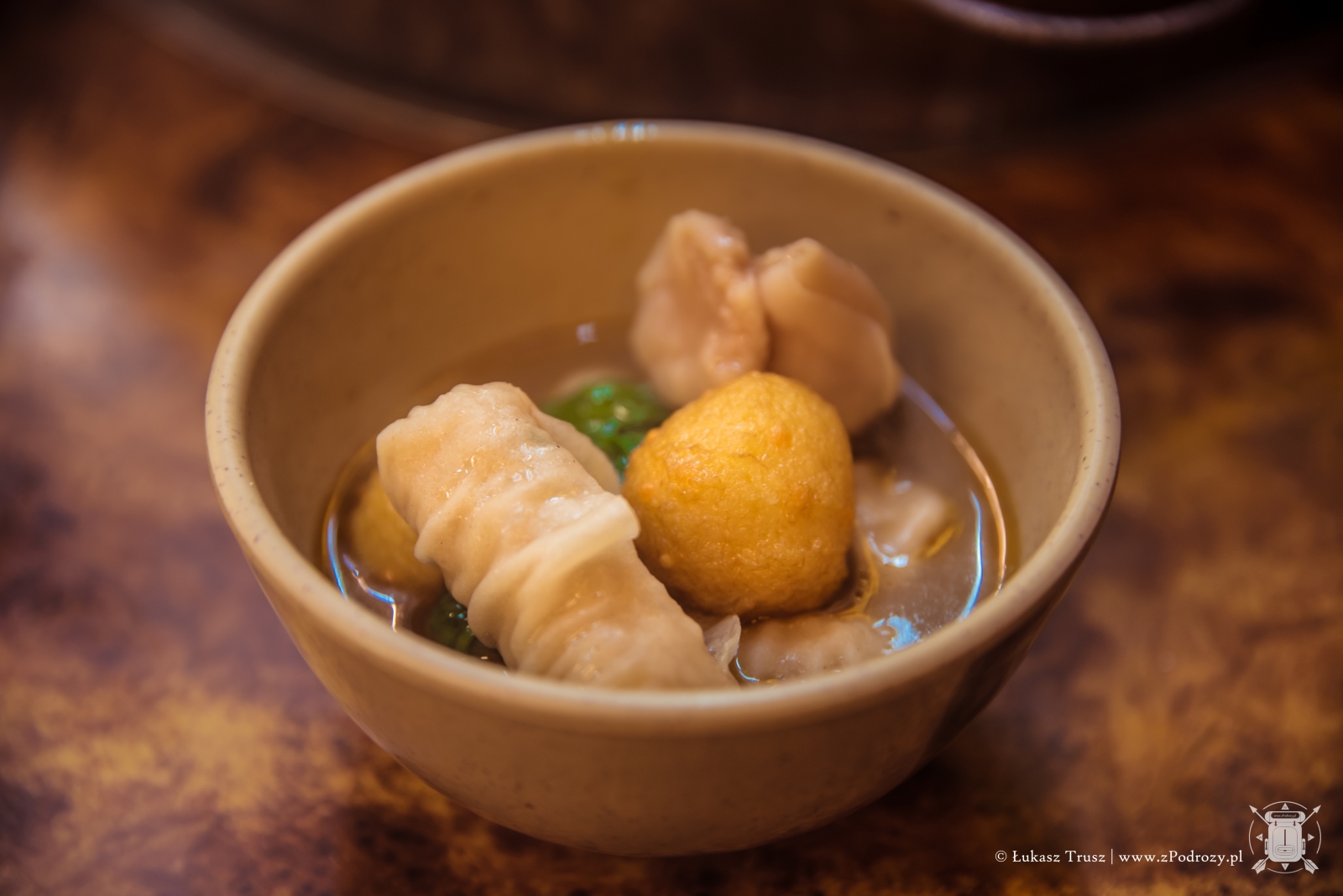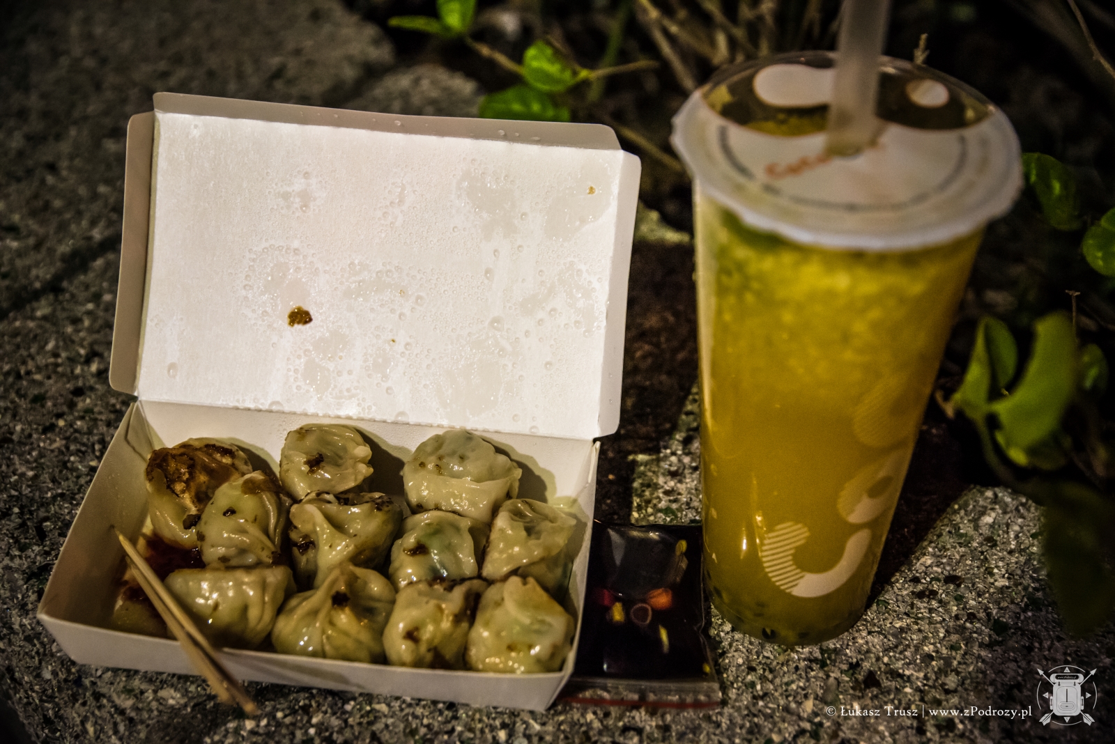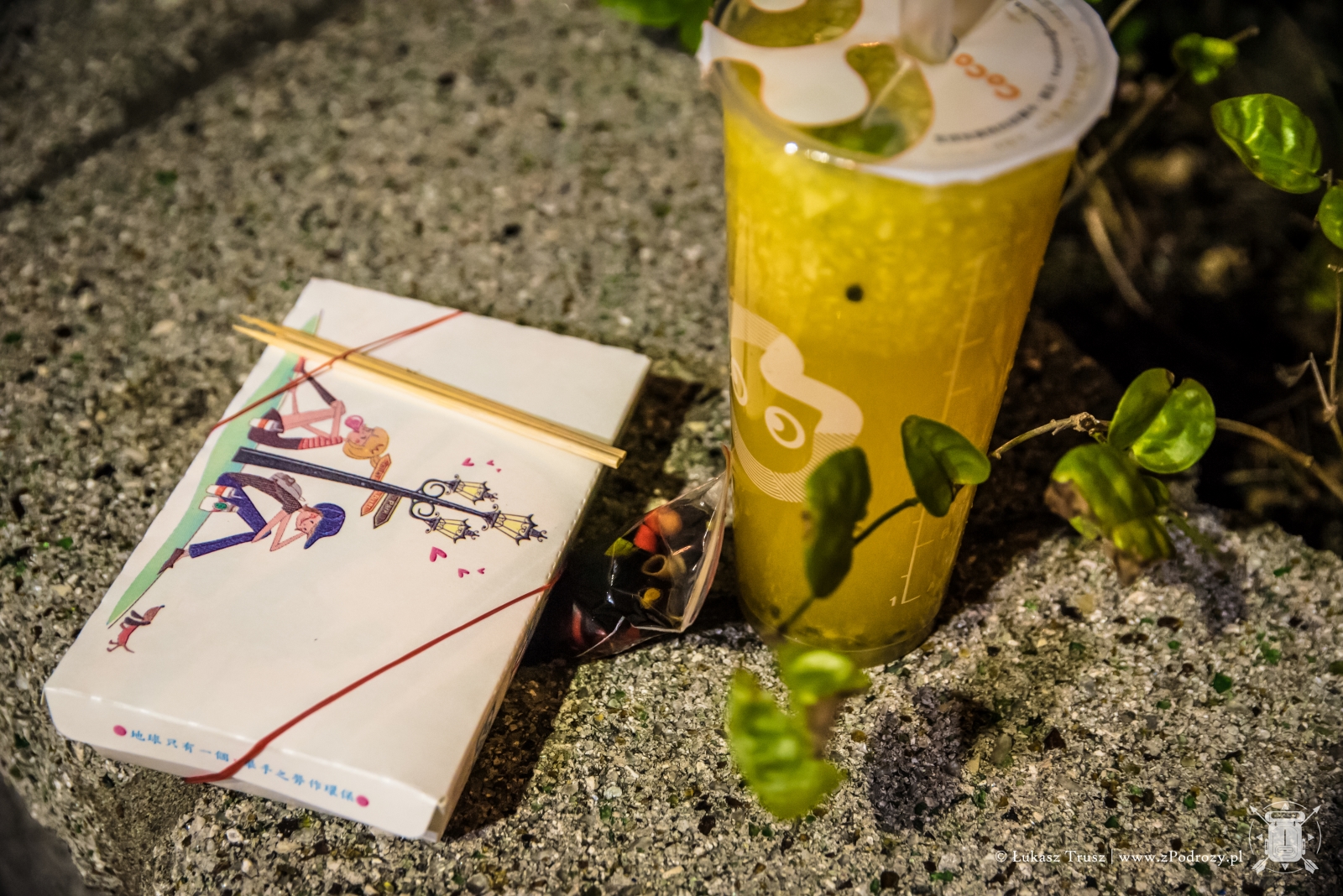 Co do jedzenia to trafiliśmy tutaj na swój pierwszy “hot pot”, czyli dosłownie “gorący garnek”! Jak to działa? A no już tłumaczę. Siadamy przy stole z dziurą po środku, która okuta jest metalową obręczą. Obsługa przynosi nam koszyk z żarem, który wkłada do dziury, a na to stawiają gar z gotującym się już wywarem. Dalej przejmujemy “kucharską pałeczkę” we własne ręce i czynimy cuda sami. Dostajemy także karteczkę z możliwością wyboru co chcemy, aby nam podano do gotowania (przeróżne mięsa, pierożki, itp.). Treść jest niestety po chińsku, więc udaję się żwawo do lady i mówię Pani, że biorę wszystko co polecają, bo ssie mnie nieziemsko! A tak serio, to wybudzam swoje pierwotne instynkty i macham palcami pokazując, co chętnie zaserwuje swoim kubkom smakowym. Pani ekspedientka dorzuca coś od siebie pokazując, że “to i to” też będzie super. Wracam do stołu, mija chwila i dostajemy 2 talerze z zieleniną i resztę mięsnych smakołyków. Ucztować tak można do białego rana. Gdy wywaru braknie, to nam za darmo dolewają. A przyznać muszę, że był wyborny! Nawet sama zielenina popijana tajwańskim rosołem smakowała jak wykwintne danie.