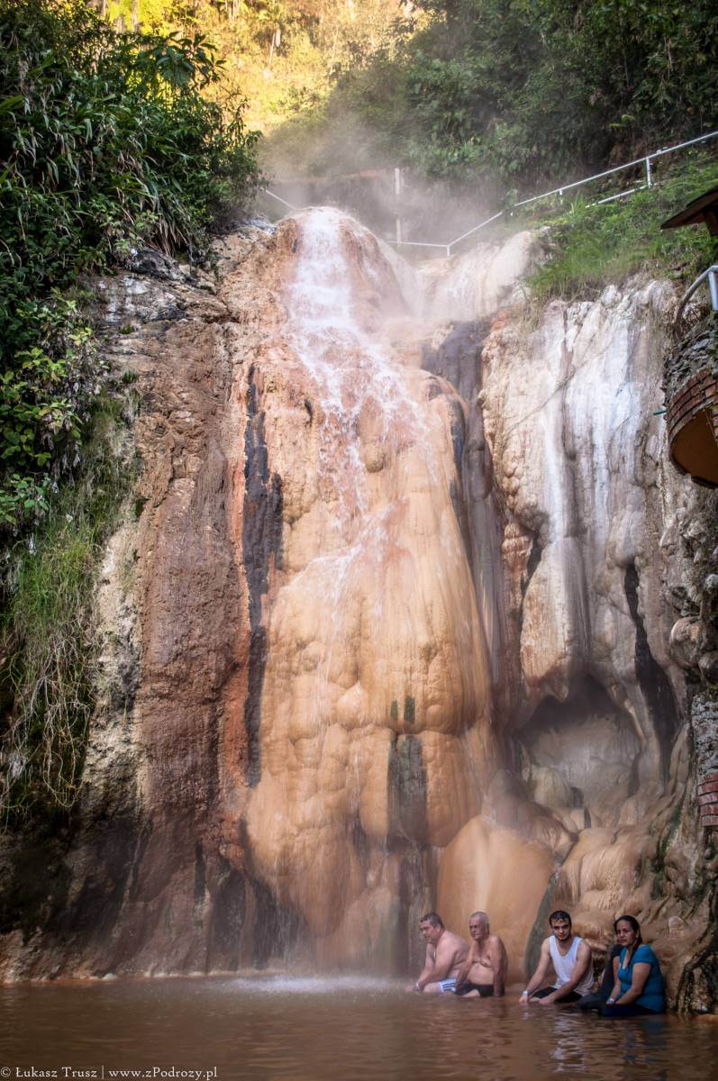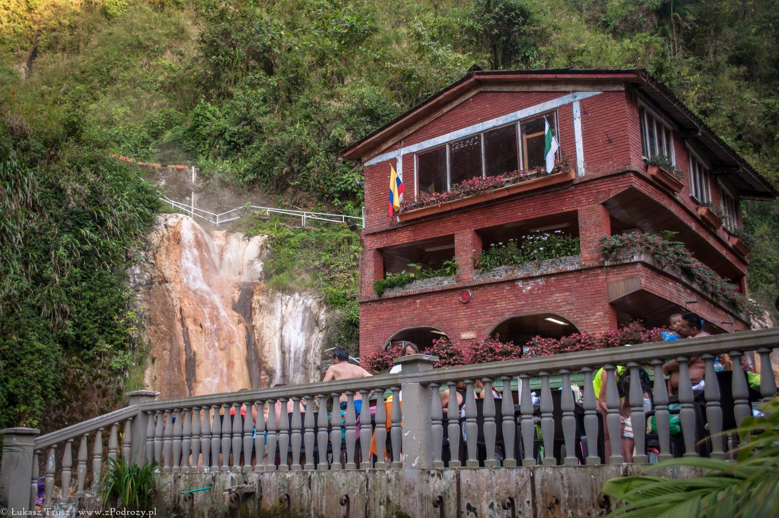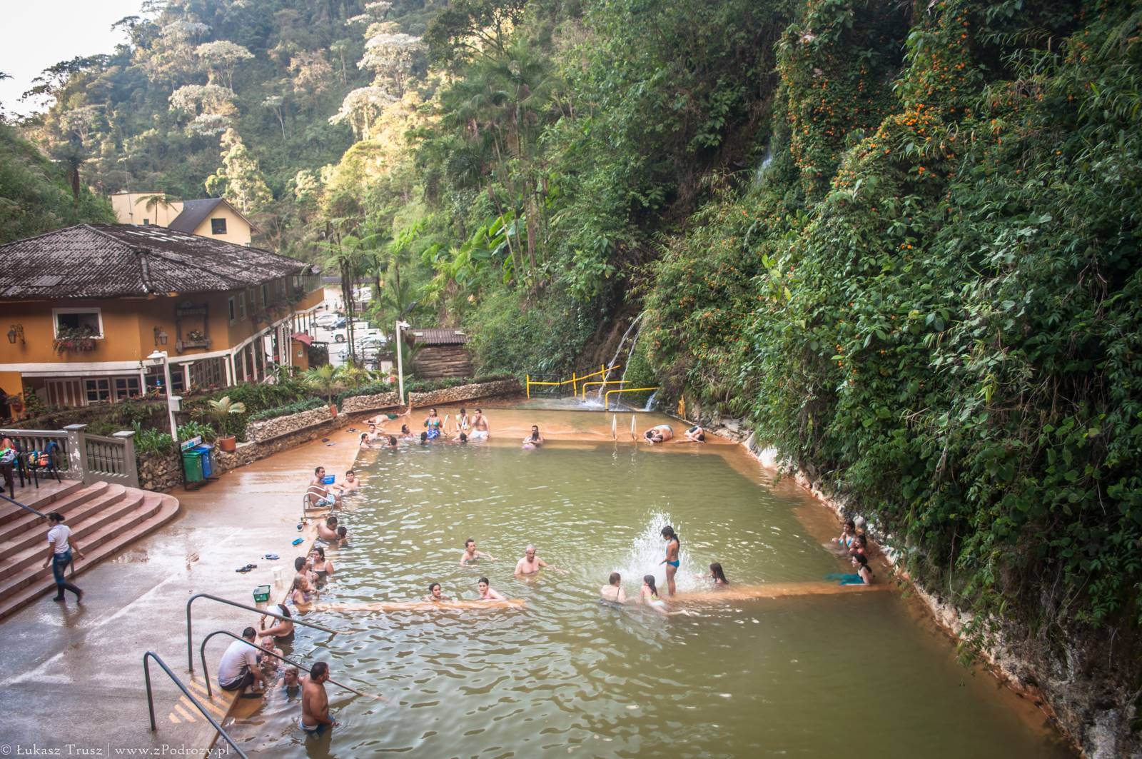 Na początek prawdziwa petarda! Termy położone między górskimi szczytami na wysokości ok 2800 m.n.p.m w miejscowości Santa Rosa de Cabal. Woda doprowadzona jest wprost z górskich wodospadów, a wszystko dodatkowo otoczone zieloną i gęstą roślinnością. Co więcej wszędzie unosi się gorąca para, która dopełnia ten magiczny widok. Wygląda to wprost majestatycznie. Dostęp do gorących źródeł jest do godziny 1.00 w nocy. Przynajmniej w tym kompleksie, do którego udało nam się dostać, a jest ich kilka. Na miejscu możemy napić się świeżo wyciskanych soków lub spróbować lokalnej kuchni i piwa. Niestety nic nie jest w stanie oddać tego cudownego klimatu, który trzeba poczuć na własnej skórze. Zapraszam zatem od razu do zdjęć, aby mieć chociaż szansę sobie to wszystko wyobrazić.