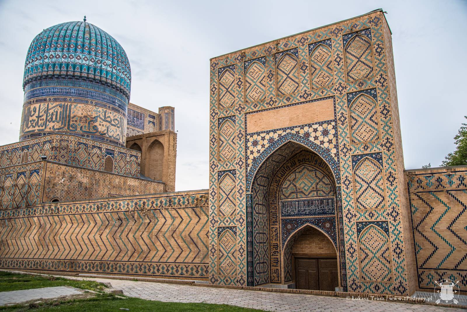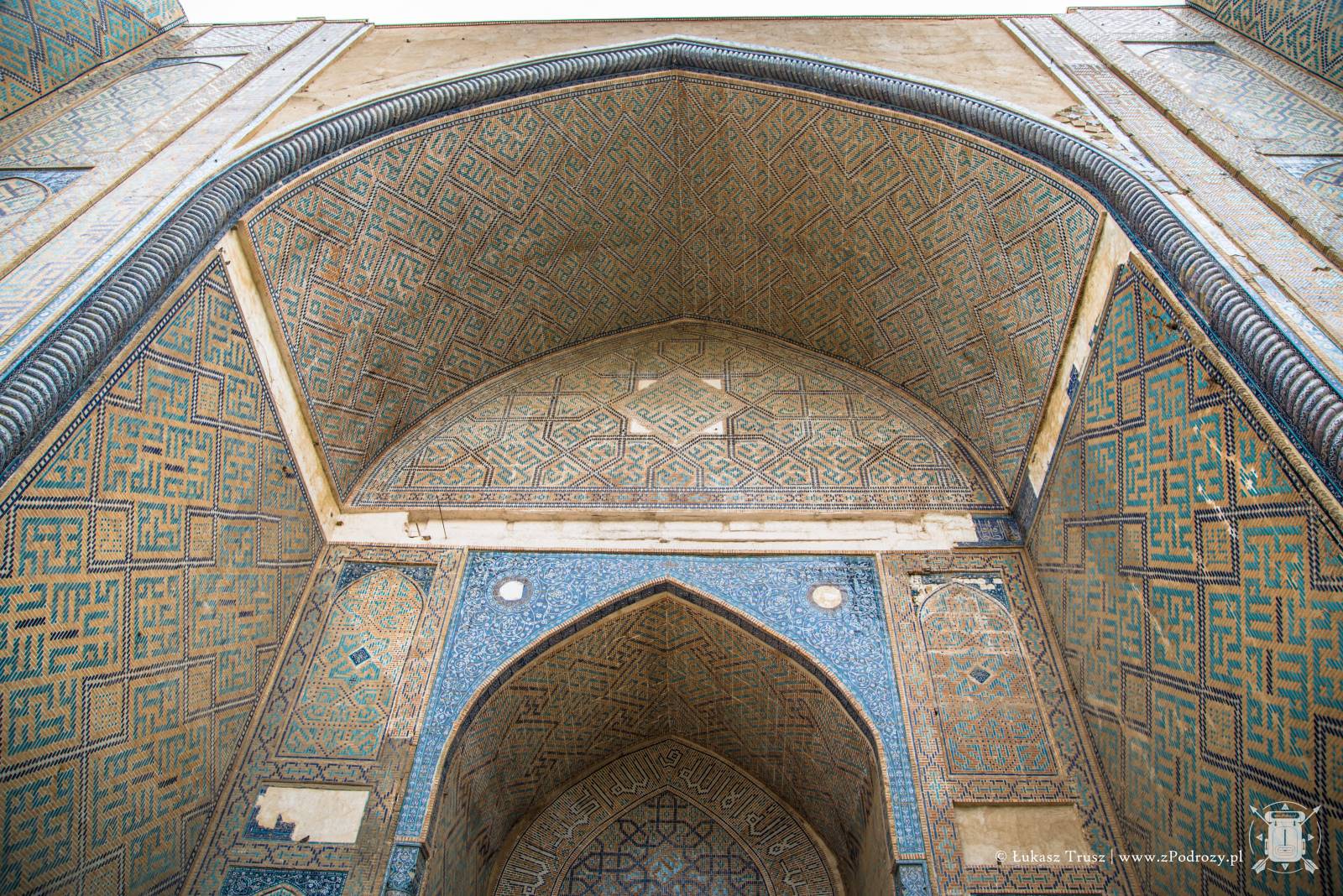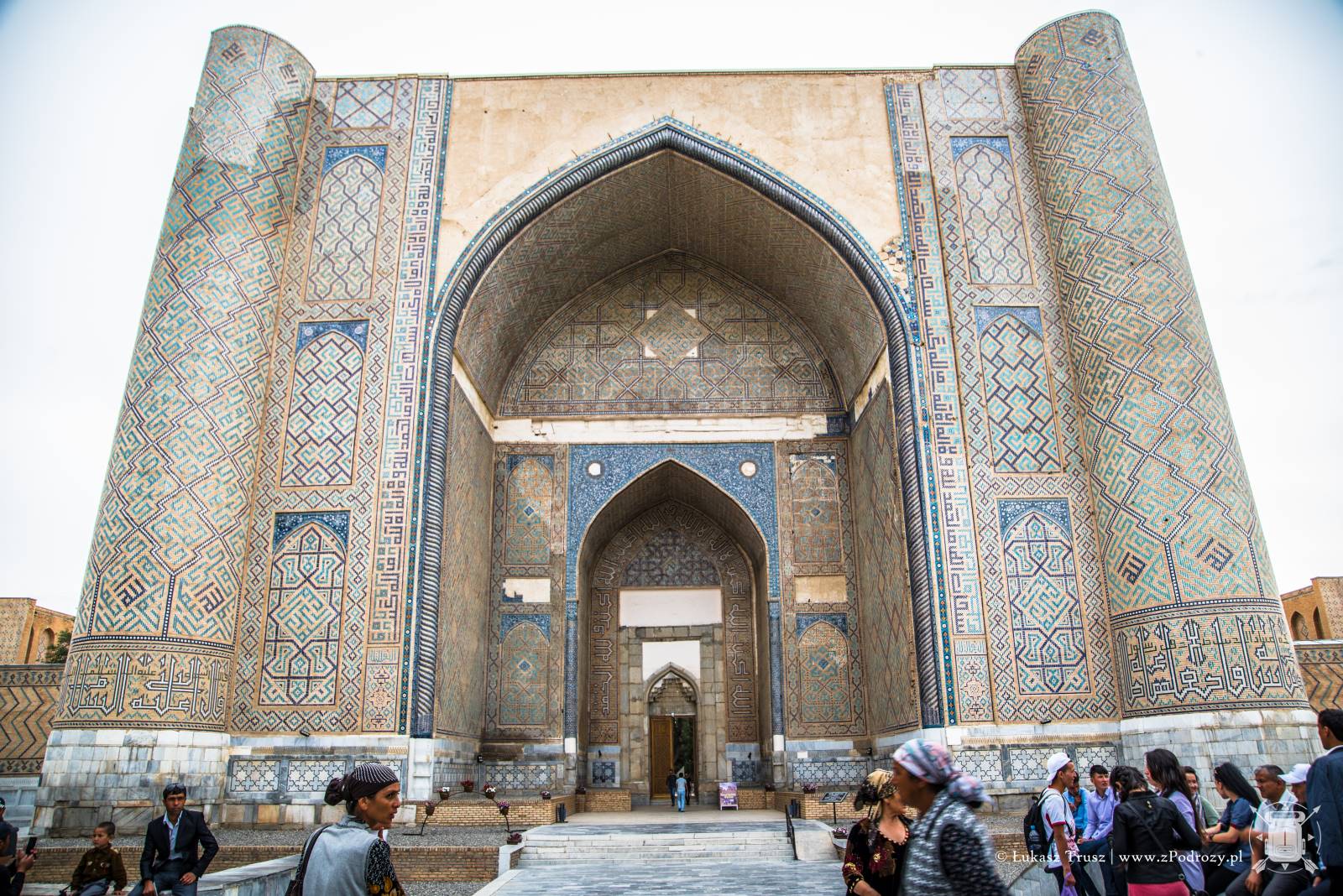 Meczet położony jest kilkaset metrów od Registanu i możemy do niego dojść deptakiem. Niezwykła pamiątka jaką zostawił po sobie Timur. Podobno przy jego pracy wykorzystano ponad 90 słoni sprowadzonych z Indii. Sam łuk wejściowy mierzy 35 metrów, a przynależne do niego minarety aż 50! Stojąc u jego bram ciężko nie zadzierać głowy do góry, próbując objąć go wzrokiem. Legendy mówią, że Timur osobiście rzucał złoto i pieczone mięso robotnikom, aby się im przypodobać i zachęcić ich do pracy. Meczet był wybudowany na cześć jego żony Saraj Mulk Chanum, która spoczęła w pobliskim mauzoleum.