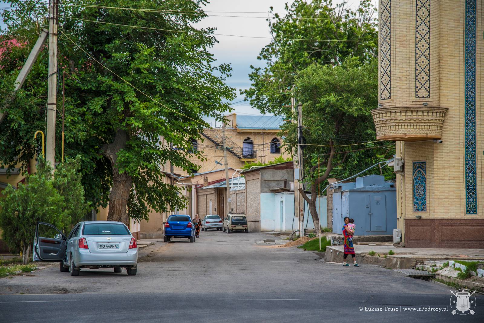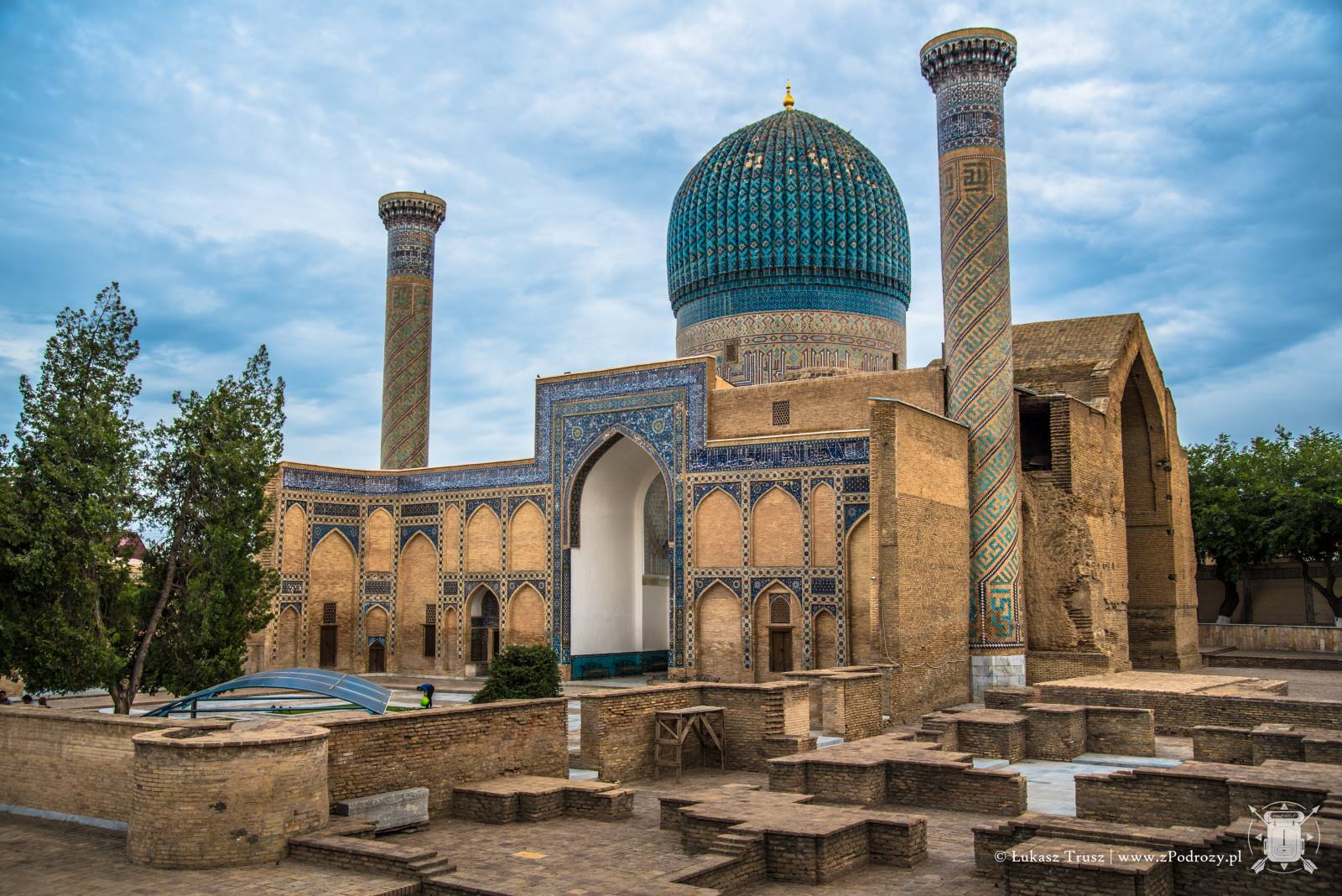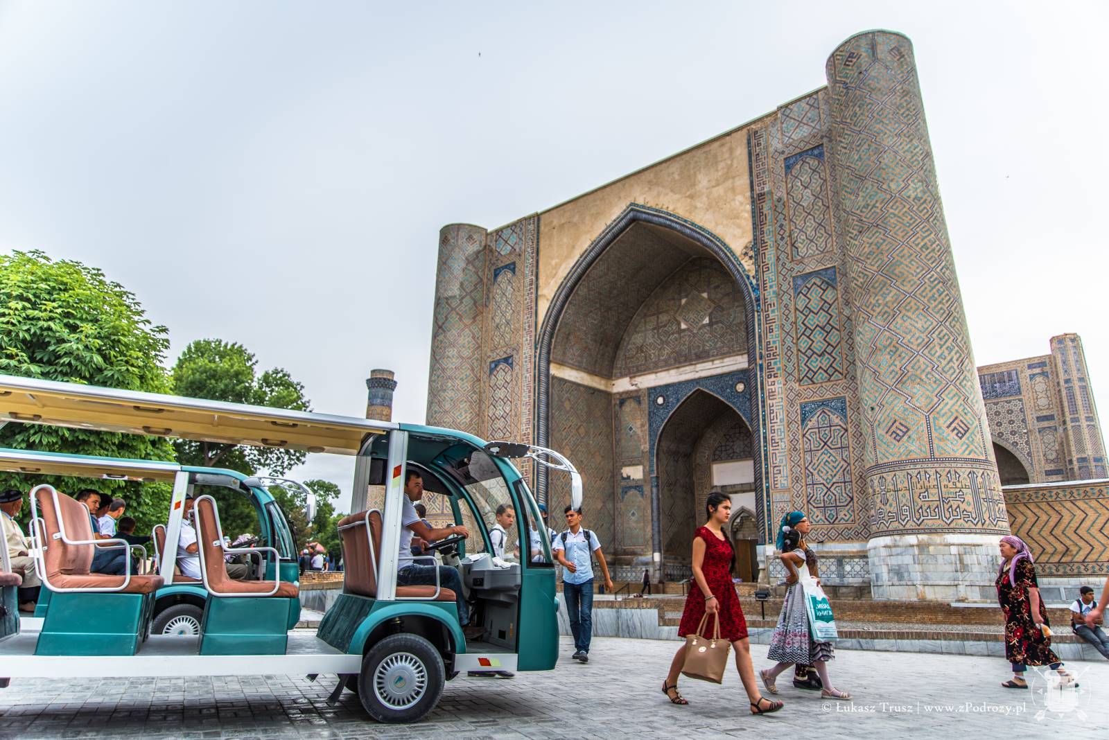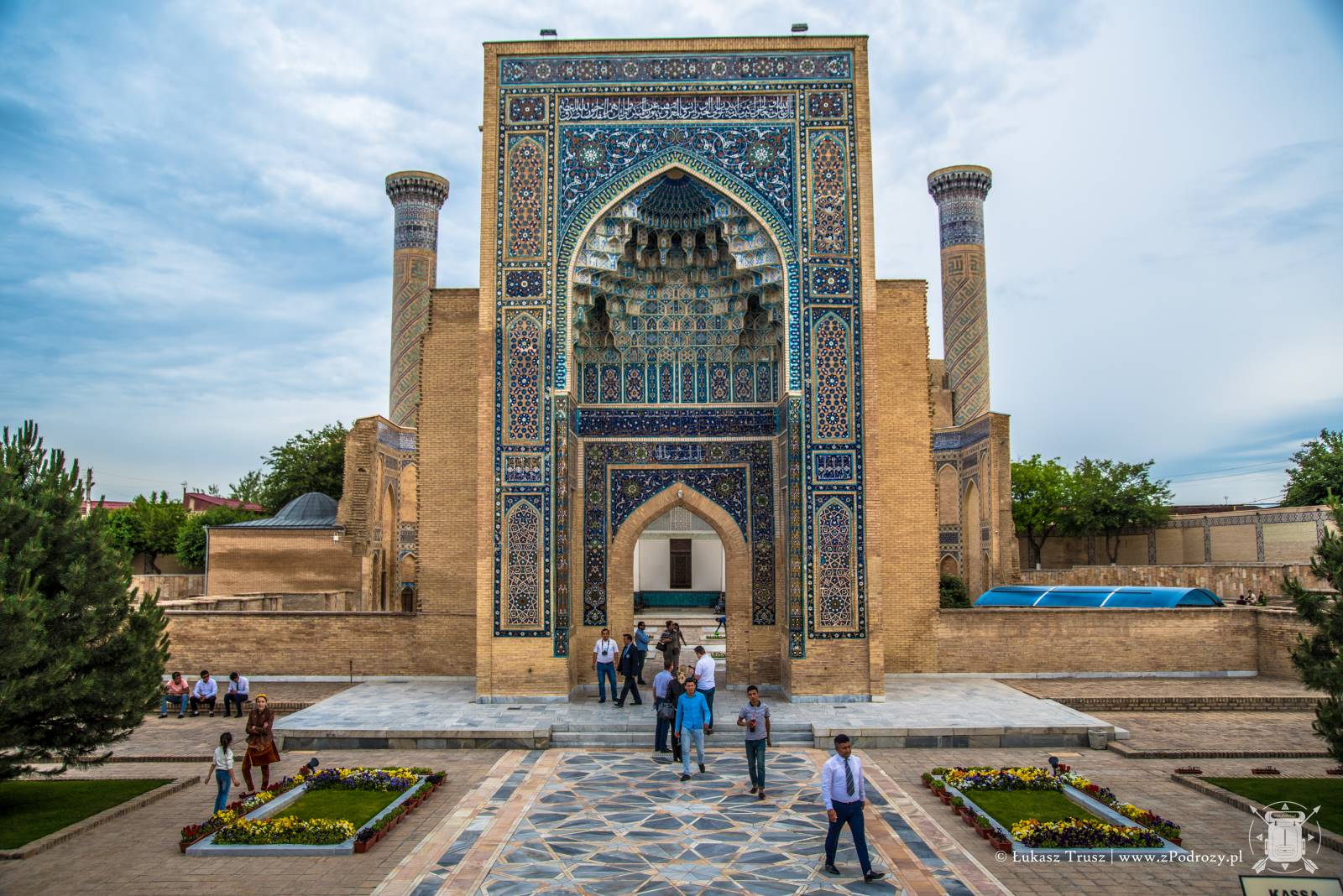 Meczet położony jest kilkaset metrów od Registanu i możemy do niego dojść deptakiem. Niezwykła pamiątka jaką zostawił po sobie Timur. Podobno przy jego pracy wykorzystano ponad 90 słoni sprowadzonych z Indii. Sam łuk wejściowy mierzy 35 metrów, a przynależne do niego minarety aż 50! Stojąc u jego bram ciężko nie zadzierać głowy do góry, próbując objąć go wzrokiem. Legendy mówią, że Timur osobiście rzucał złoto i pieczone mięso robotnikom, aby się im przypodobać i zachęcić ich do pracy. Meczet był wybudowany na cześć jego żony Saraj Mulk Chanum, która spoczęła w pobliskim mauzoleum.