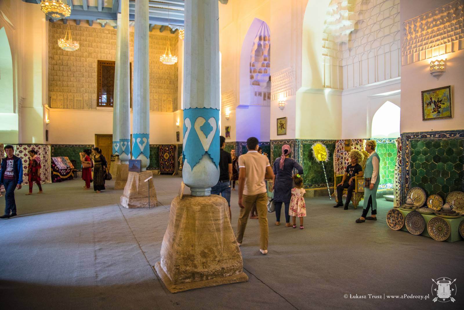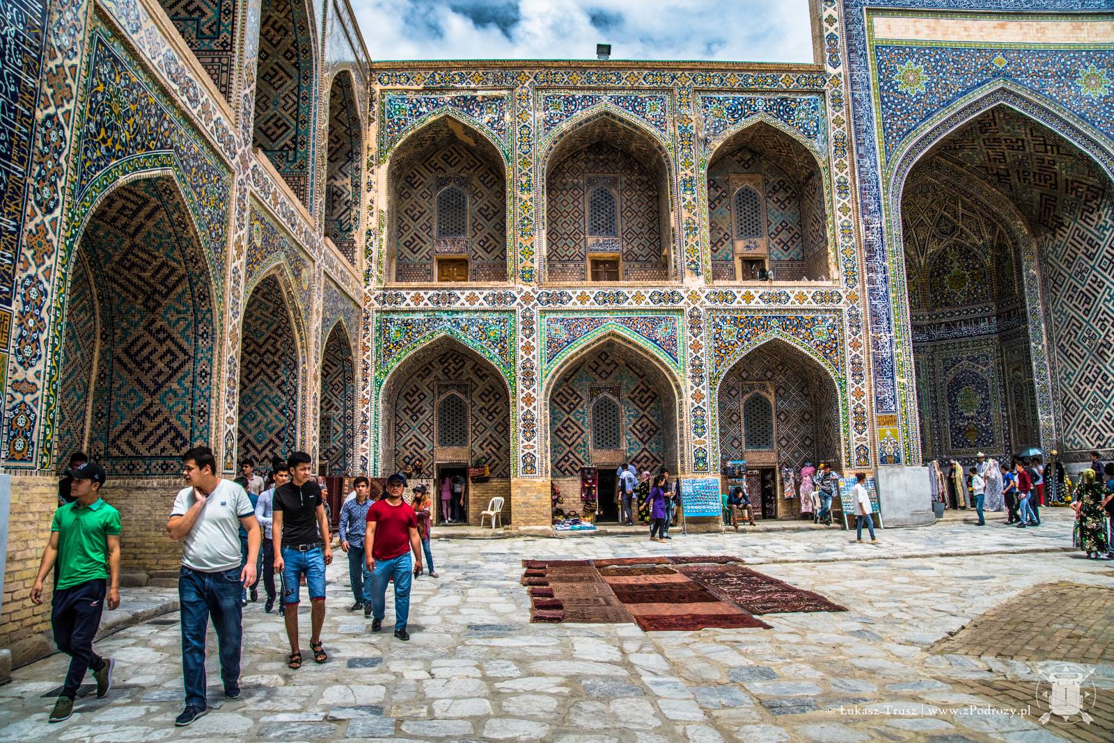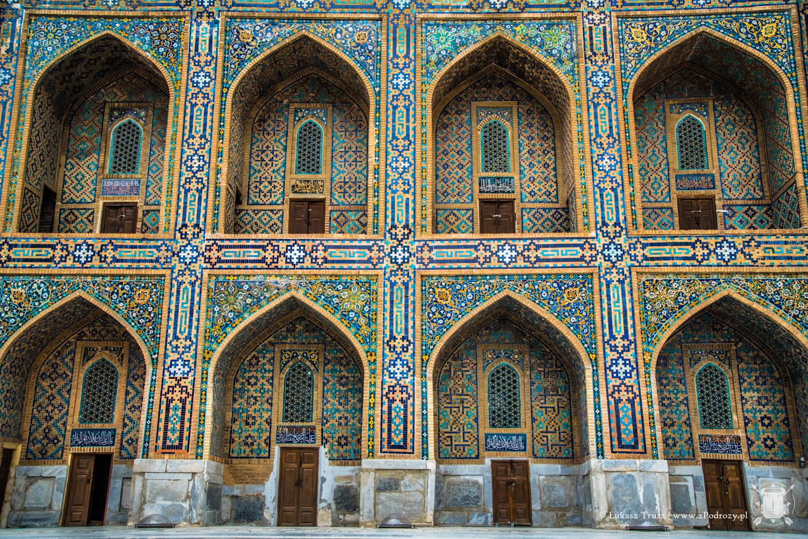 Gdy przekroczymy ogromne kolorowe bramy, w środku zobaczymy plac z niewielkimi drzewami i miejscami do odpoczynku. Natomiast w murach kryją się niewielkie pokoje, a właściwie cele w których studenci pobierali nauki. Obecnie znajdują się tam sklepiki z rękodziełami, jednak Uzbecy chętnie opowiadają historię miejsc, w których urzędują. Miejsca w celi jest niewiele. Pomieści może kilka osób. Na ziemi klasycznie znajdziemy dywan, miejsce na palenisko, a na ścianach półki, gdzie niegdyś stały księgi pełne wiedzy. Miejsce magiczne. Warto przysiąść z boku i się tutaj zadumać. Ogrom pracy jaki musiał być włożony w ich powstanie jest niesamowity. Co większe komnaty nadal są zdobione złotem. Kafelki w piaskowych, turkusowych oraz niebieskich kolorach mienią się w blasku słońca wspominając lata swojej świetności. Móc zobaczyć to miejsce, gdy tętniło życiem, to byłoby coś!