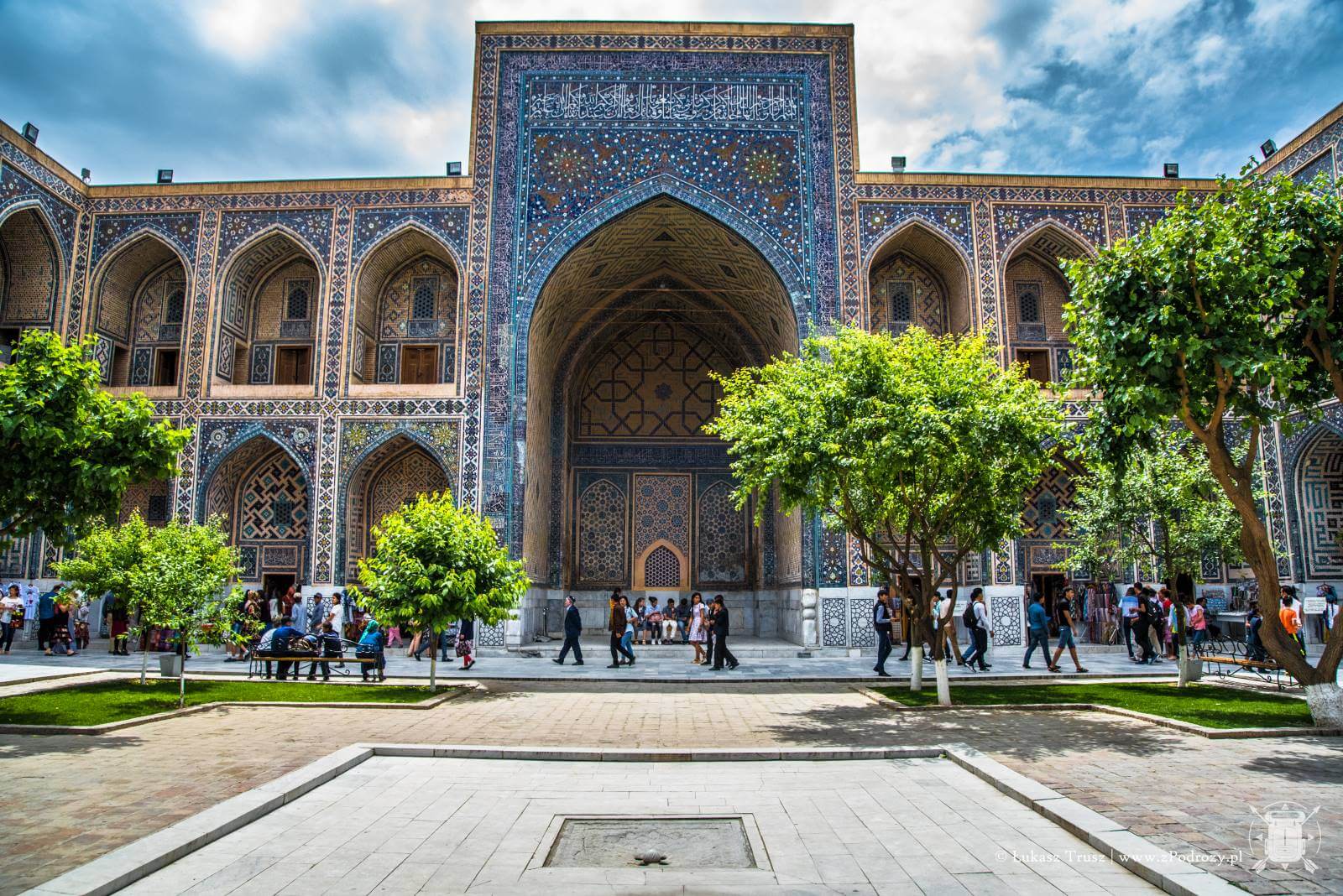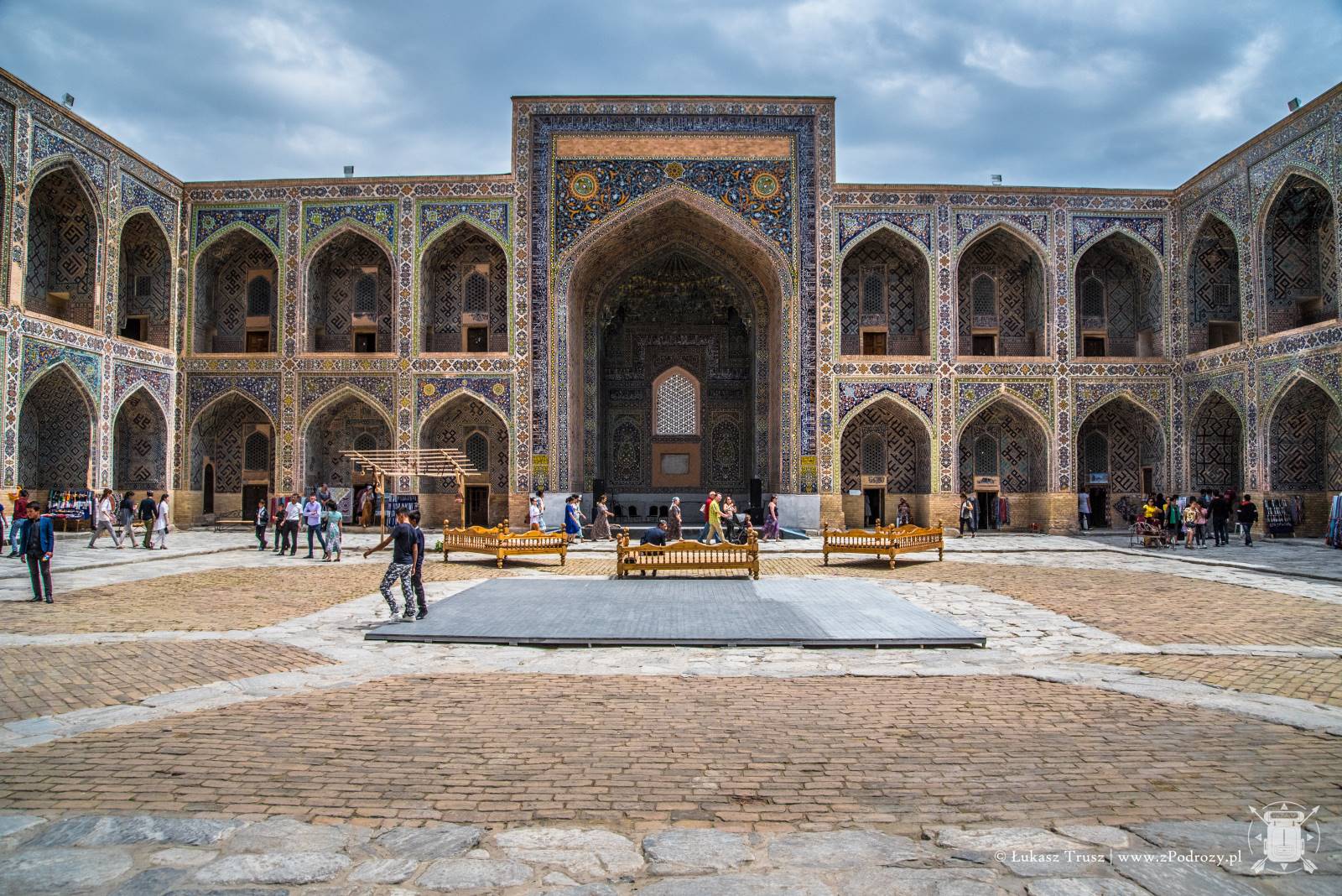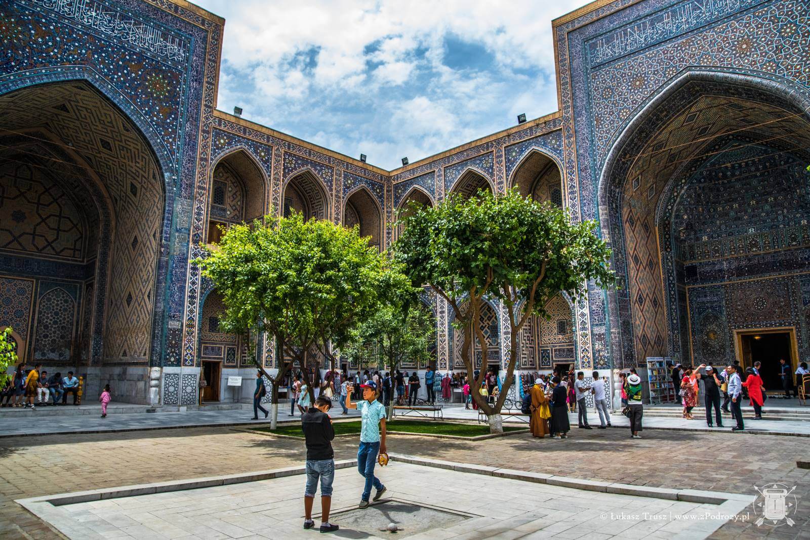 Gdy przekroczymy ogromne kolorowe bramy, w środku zobaczymy plac z niewielkimi drzewami i miejscami do odpoczynku. Natomiast w murach kryją się niewielkie pokoje, a właściwie cele w których studenci pobierali nauki. Obecnie znajdują się tam sklepiki z rękodziełami, jednak Uzbecy chętnie opowiadają historię miejsc, w których urzędują. Miejsca w celi jest niewiele. Pomieści może kilka osób. Na ziemi klasycznie znajdziemy dywan, miejsce na palenisko, a na ścianach półki, gdzie niegdyś stały księgi pełne wiedzy. Miejsce magiczne. Warto przysiąść z boku i się tutaj zadumać. Ogrom pracy jaki musiał być włożony w ich powstanie jest niesamowity. Co większe komnaty nadal są zdobione złotem. Kafelki w piaskowych, turkusowych oraz niebieskich kolorach mienią się w blasku słońca wspominając lata swojej świetności. Móc zobaczyć to miejsce, gdy tętniło życiem, to byłoby coś!